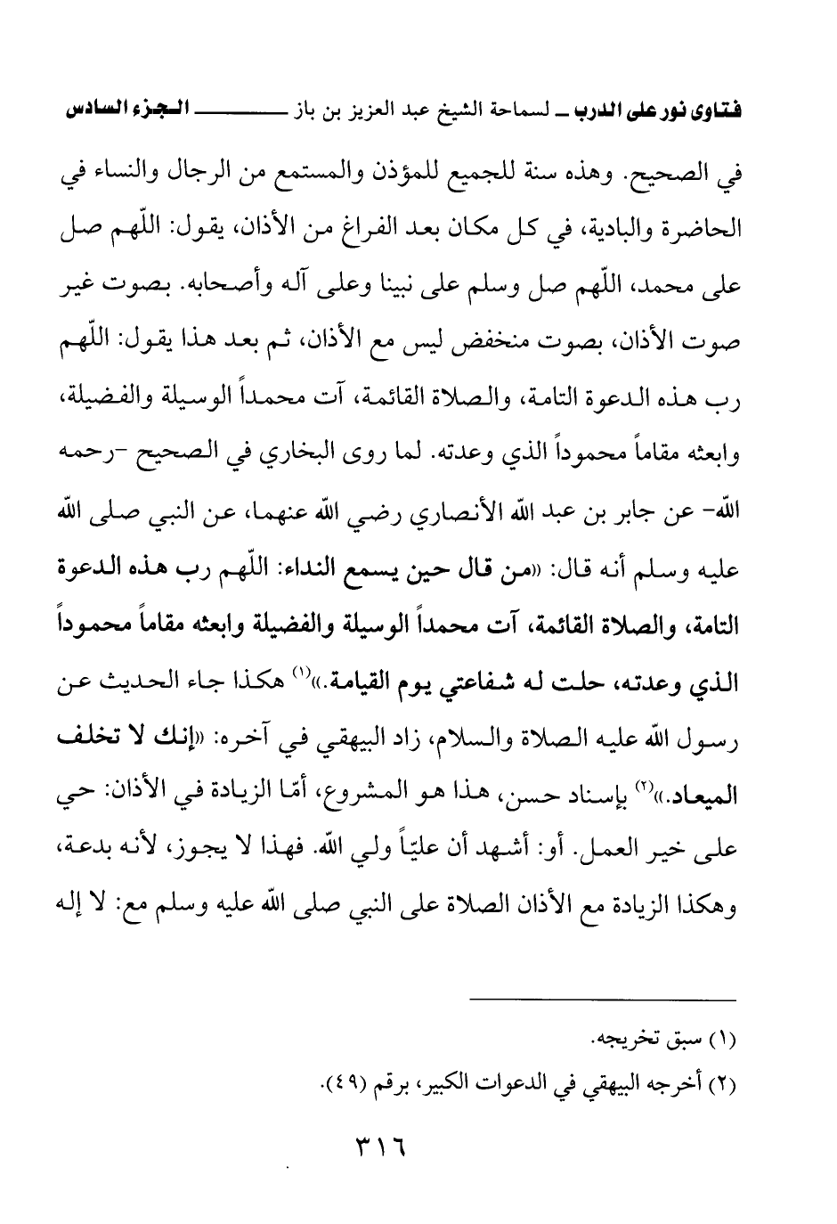 وهذه سنة للجميع للمؤذن والمستمع من الرجال والنساء في الحاضرة والبادية في كل مكان بعد الفراغ من الأذان، يقول: اللهم صل على محمد، اللهم صل وسلم على نبينا وعلى آله وأصحابه. بصوت غير صوت الأذان، بصوت منخفض ليس مع الأذان، ثم بعد هذا يقول: اللهم رب هذه الدعوة التامة والصلاة القائمة آت محمدا الوسيلة والفضيلة، وابعثه مقاما محمودا الذي وعدته. لما روى البخاري في الصحيح - رحمه الله - عن جابر بن عبد الله الأنصاري رضي الله عنهما، عن النبي صلى الله عليه وسلم أنه قال: «من قال حين يسمع النداء: اللهم رب هذه الدعوة التامة، والصلاة القائمة، آت محمدا الوسيلة والفضيلة وابعثه مقاما محمودا الذي وعدته، حلت له شفاعتي يوم القيامة (¬1)» هكذا جاء الحديث عن رسول الله عليه الصلاة والسلام، زاد البيهقي في آخره: «إنك لا تخلف الميعاد (¬2)» بإسناد حسن، هذا هو المشروع، أما الزيادة في الأذان: حي على خير العمل. أو: أشهد أن عليا ولي الله. فهذا لا يجوز لأنه بدعة، وهكذا الزيادة مع الأذان الصلاة على النبي صلى الله عليه وسلم مع: لا إله