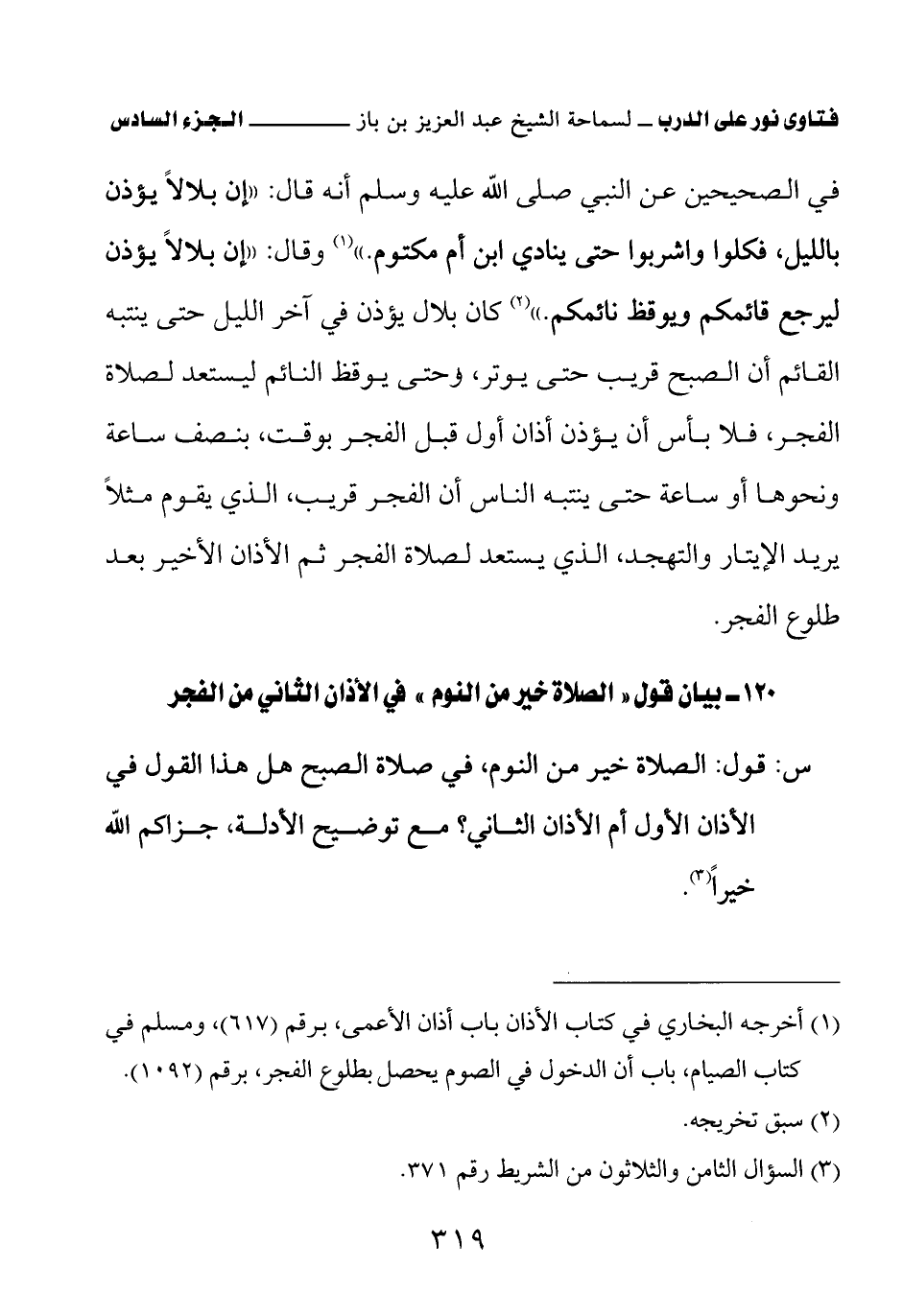 في الصحيحين عن النبي صلى الله عليه وسلم أنه قال: «إن بلالا يؤذن بالليل، فكلوا واشربوا حتى ينادي ابن أم مكتوم (¬1)» وقال: «إن بلالا يؤذن ليرجع قائمكم ويوقظ نائمكم (¬2)» كان بلال يؤذن في آخر الليل حتى ينتبه القائم أن الصبح قريب حتى يوتر وحتى يوقظ النائم ليستعد لصلاة الفجر، فلا بأس أن يؤذن أذان أول قبل الفجر بوقت بنصف ساعة ونحوها أو ساعة حتى ينتبه الناس أن الفجر قريب، الذي يقوم مثلا يريد الإيتار والتهجد الذي يستعد لصلاة الفجر ثم الأذان الأخير بعد طلوع الفجر.