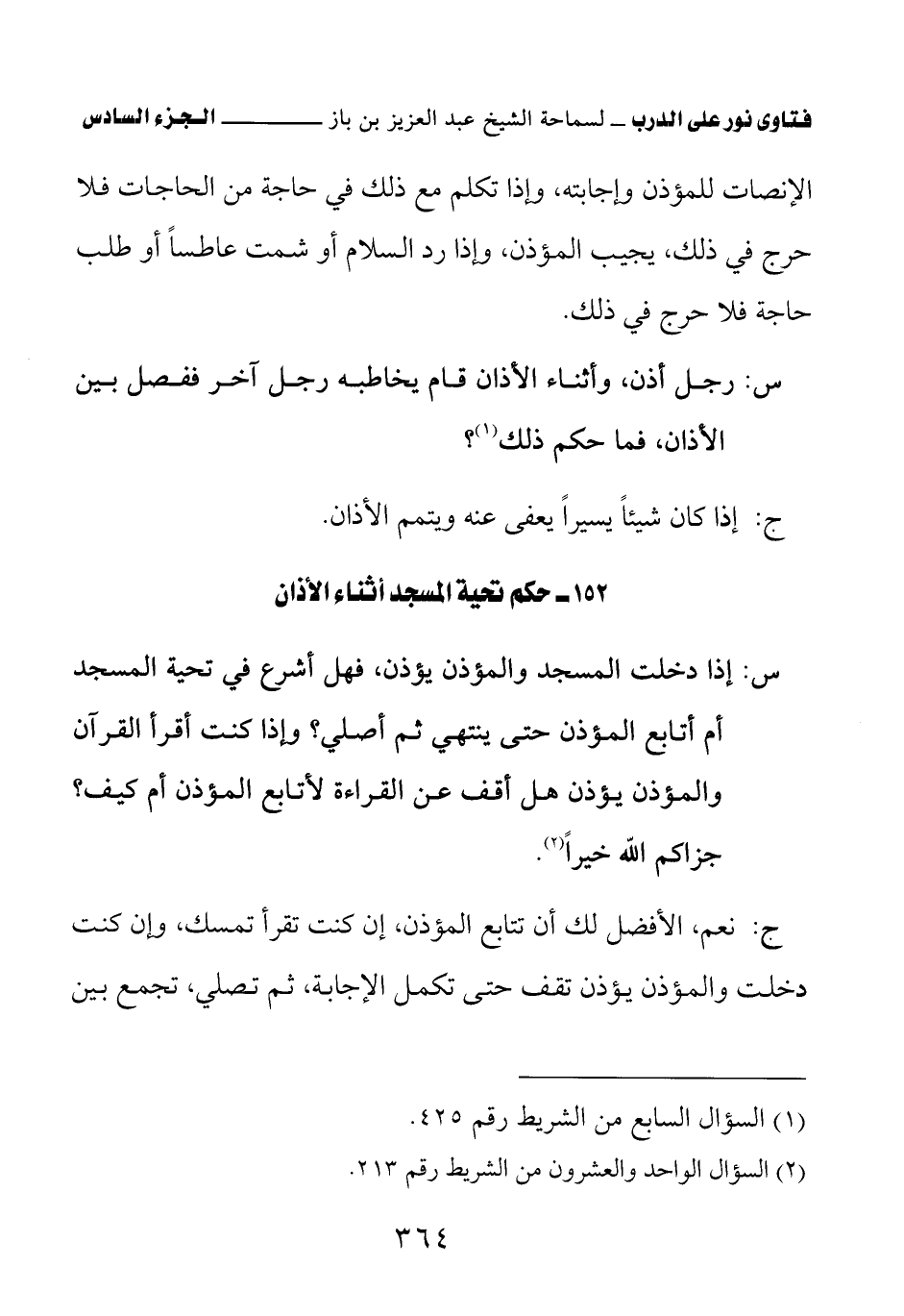الإنصات للمؤذن وإجابته، وإذا تكلم مع ذلك في حاجة من الحاجات فلا حرج في ذلك، يجيب المؤذن وإذا رد السلام أو شمت عاطسا أو طلب حاجة فلا حرج في ذلك.