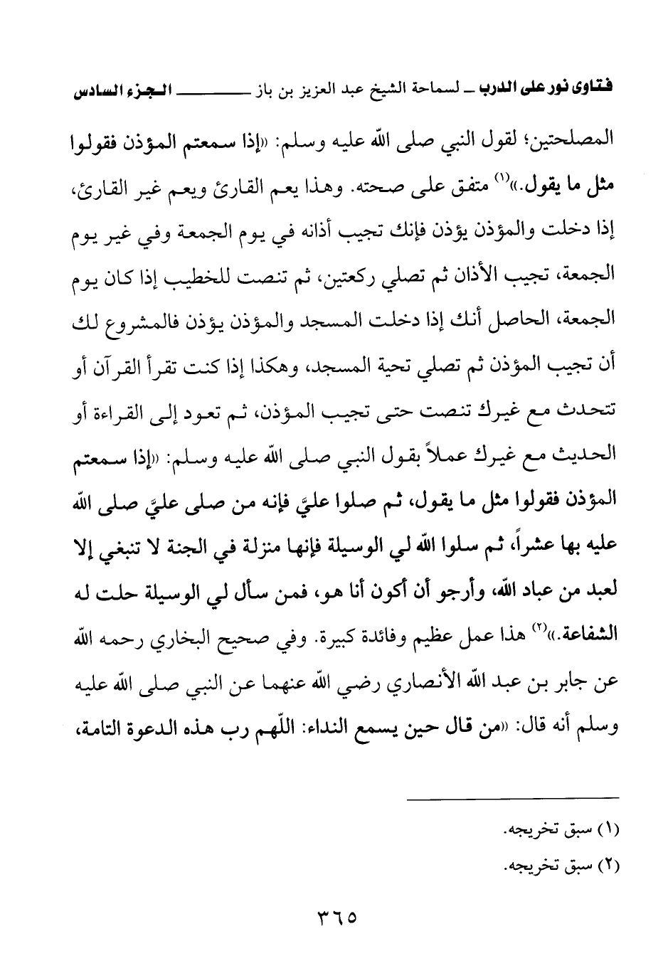 وهذا يعم القارئ ويعم غير القارئ إذا دخلت والمؤذن يؤذن فإنك تجيب أذانه في يوم الجمعة وفي غير يوم الجمعة، تجيب الأذان ثم تصلي ركعتين ثم تنصت للخطيب إذا كان يوم الجمعة، الحاصل أنك إذا دخلت المسجد والمؤذن يؤذن فالمشروع لك أن تجيب المؤذن ثم تصلي تحية المسجد وهكذا إذا كنت تقرأ القرآن أو تتحدث مع غيرك تنصت حتى تجيب المؤذن، ثم تعود إلى القراءة أو الحديث مع غيرك عملا بقول النبي صلى الله عليه وسلم: «إذا سمعتم المؤذن فقولوا مثل ما يقول ثم صلوا علي فإنه من صلى علي واحدة صلى الله عليه بها عشرا، ثم سلوا الله لي الوسيلة فإنها منزلة في الجنة لا تنبغي إلا لعبد من عباد الله، وأرجو أن أكون أنا هو، فمن سأل لي الوسيلة حلت له الشفاعة (¬2)» هذا عمل عظيم وفائدة كبيرة.