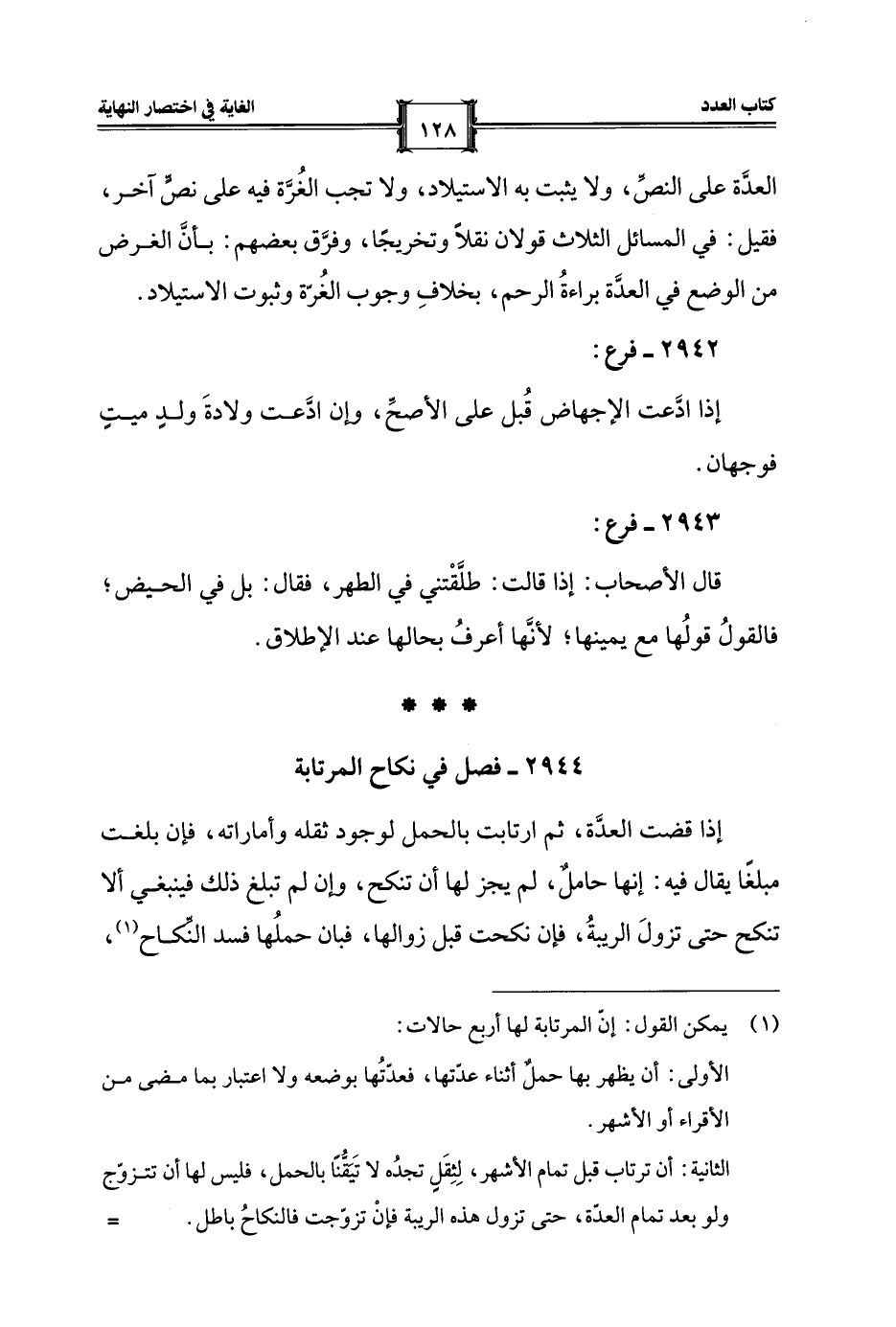 الثانية: أن ترتاب قبل تمام الأشهر، لِثِقَلٍ تجدُه لا تَيقُّنًا بالحمل، فليس لها أن تتزوّج ولو بعد تمام العدّة، حتى تزول هذه الريبة فإنْ تزوّجت فالنكاحُ باطل.=