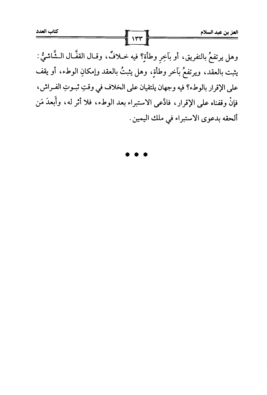 وهل يرتفعُ بالتفريق، أو بآخِرِ وطأةٍ؟ فيه خلافٌ، وقال القفَّال الشَّاشيُّ: يثبت بالعقد، ويرتفعُ بآخر وطأةٍ، وهل يثبتُ بالعقد وإمكانِ الوطء، أو يقف على الإقرار بالوطء؟ فيه وجهان يلتقيان على الخلاف في وقتِ ثبوتِ الفراش، فإنْ وقفناه على الإقرار، فادَّعى الاستبراء بعد الوطء، فلا أثر له، وأَبعدَ مَن ألحقه بدعوى الاستبراء في ملك اليمين.