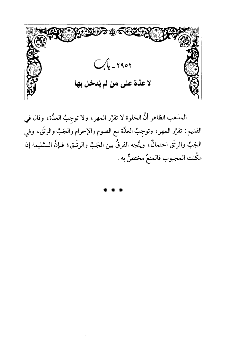 المذهب الظاهر أنَّ الخلوة لا تقرِّر المهر، ولا توجِبُ العدَّة، وقال في القديم: تقرِّر المهر، وتوجِبُ العدَّة مع الصوم والإحرام والجَبِّ والرتَق، وفي الجَبِّ والرتَق احتمالٌ، ويتَّجه الفرقُ بين الجَبِّ والرتَق؛ فإنَّ السَّليمة إذا مكَّنت المجبوب فالمنعُ مختصٌّ به.
