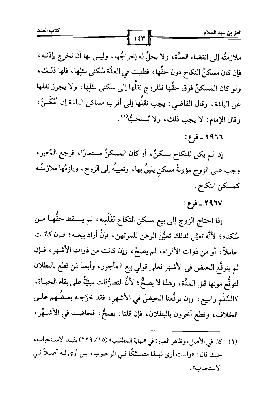 ملازمتُه إلى انقضاء العدَّة، ولا يحلُّ له إخراجُها، وليس لها أن تخرج بإذنه، فإن كان مسكنُ النكاح دون حقِّها، فطلبت في العدَّة سُكنى مثلِها، فلها ذلك، ولو كان المسكنُ فوق حقَها فللزوج نقلُها إلى سكنى مثلِها، ولا يجوز نقلها عن البلدة، وقال القاضي: يجب نقلُها إلى أقرب مساكن البلدة إن أمْكَنَ، وقال الإمام: لا يجب ذلك، ولا يُستحبُّ (¬1).