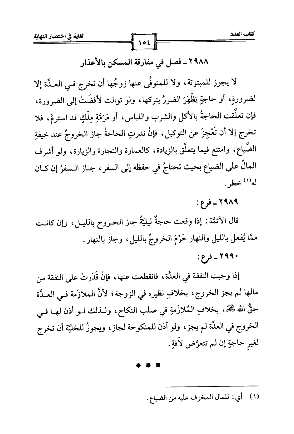 إذا وجبت النفقة في العدَّة، فانقطعت عنها، فإنْ قَدَرتْ على النفقة من مالها لم يجز الخروج، بخلافِ نظيره في الزوجة؛ لأنَّ الملازَمة في العدَّة حقُّ الله -عز وجل-، بخلافِ المُلازَمةِ في صلب النكاح، ولذلك لو أذن لها في الخروج في العدَّة لم يجز، ولو اْذن للمنكوحة لجاز، ويجوزُ للخليَّة أن تخرج لغيرِ حاجةٍ إن لم تتعرَّض لآفةٍ.