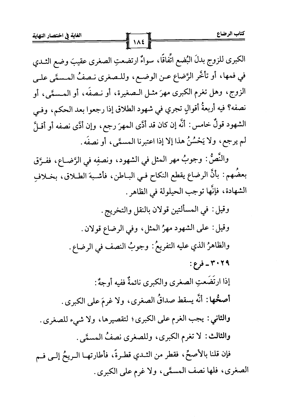 الكبرى للزوج بدلَ البُضع اتِّفاقًا، سواءٌ ارتضعتِ الصغرى عقيبَ وضع الثدي في فمها، أو تأخَّر الرَّضاع عن الوضع، وللصغرى نصفُ المسمَّى على الزوج، وهل تغرم الكبرى مهرَ مثل الصغيرة، أو نصفَه، أو المسمَّى، أو نصفه؟ فيه أربعةُ أقوالٍ تجري في شهود الطلاق إذا رجعوا بعد الحكم، وفي الشهود قولٌ خامس: أنَّه إن كان قد أدَّى المهرَ رجع، وإن أدَّى نصفه أو أقلَّ لم يرجع، ولا يَحْسُنُ هذا إلا إذا اعتبرنا المسمَّى، أو نصفَه.