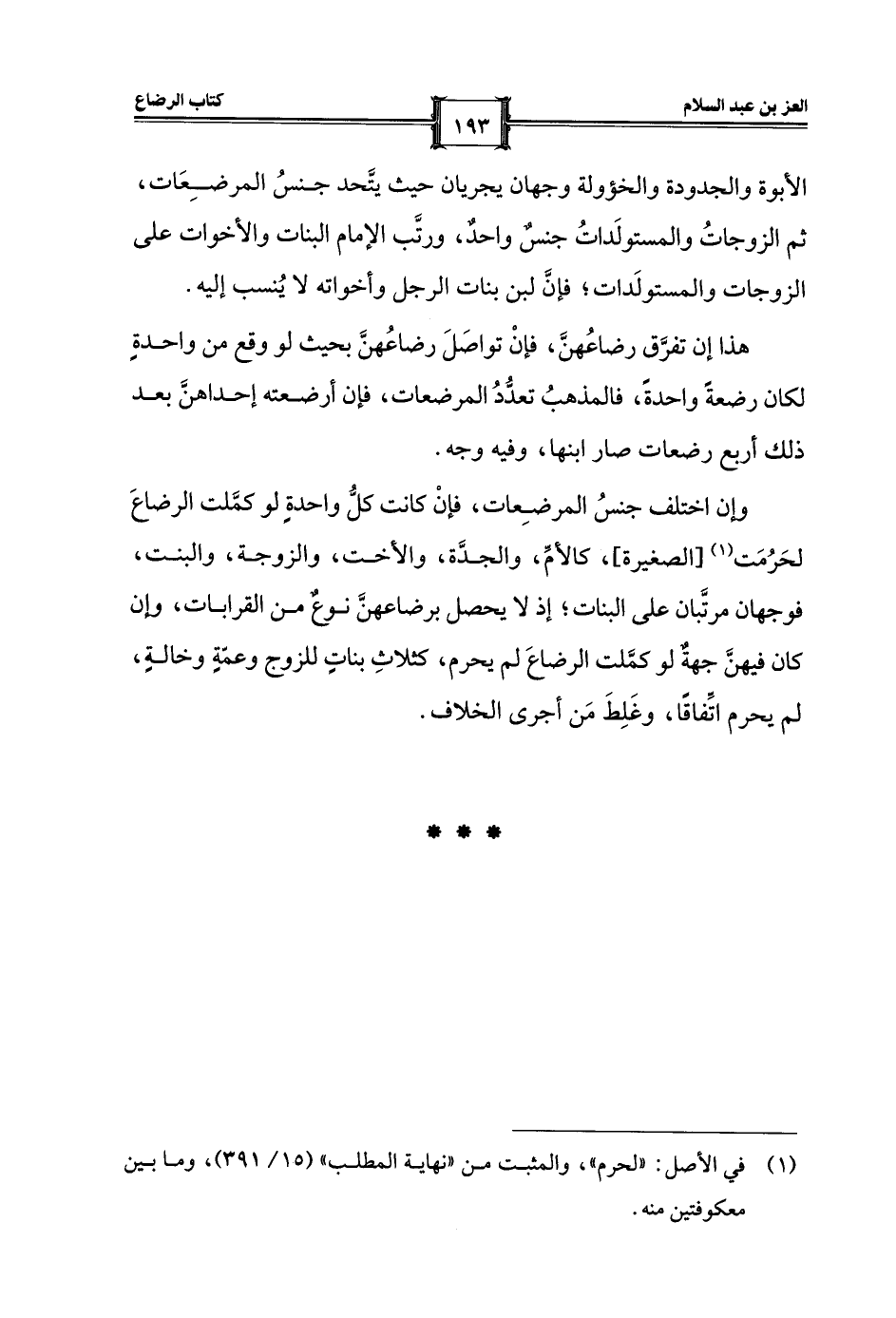 الأبوة والجدودة والخؤولة وجهان يجريان حيث يتَّحد جنسُ المرضِعَات، ثم الزوجاتُ والمستولَداتُ جنسٌ واحدٌ، ورتَّب الإمام البنات والأخوات على الزوجات والمستولَدات؛ فإنَّ لبن بنات الرجل وأخواته لا يُنسب إليه.