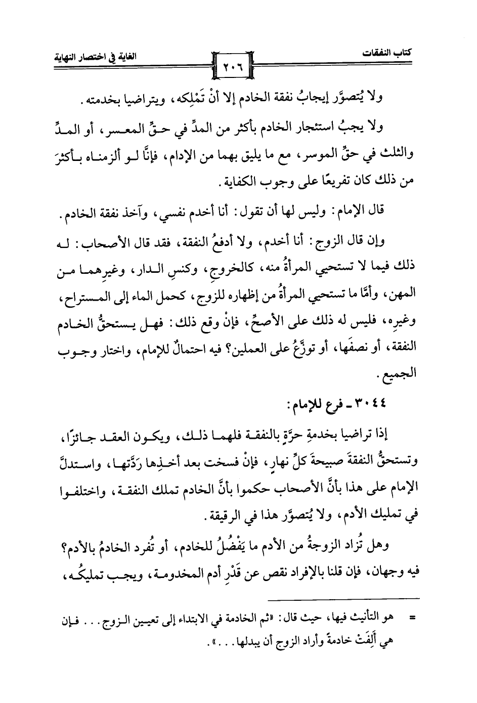 ولا يُتصوَّر إيجابُ نفقة الخادم إلا أنْ تَمْلِكه، ويتراضيا بخدمته.