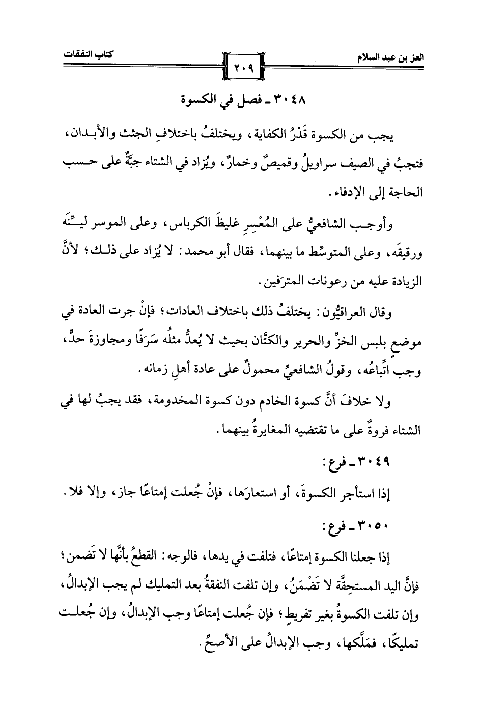 يجب من الكسوة قَدْرُ الكفاية، ويختلفُ باختلافِ الجثث والأبدان، فتجبُ في الصيف سراويلُ وقميصٌ وخمارٌ، وُيزاد في الشتاء جبَّةٌّ على حسب الحاجة إلى الإدفاء.