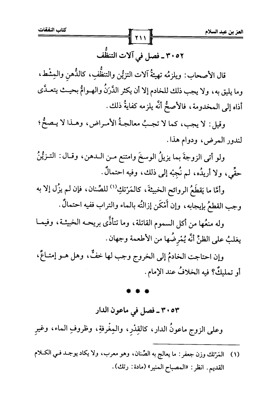قال الأصحاب: ويلزمُه تهيئةُ آلات التزيُّن والتنظُّفِ، كالدُّهنِ والمِشْط، وما يليق به، ولا يجب ذلك للخادم إلا أن يكثر الدَّرَنُ والهوامُّ بحيث يتعدَّى أذاه إلى المخدومة، فالأصحُّ أنَّه يلزمه كفايةُ ذلك.