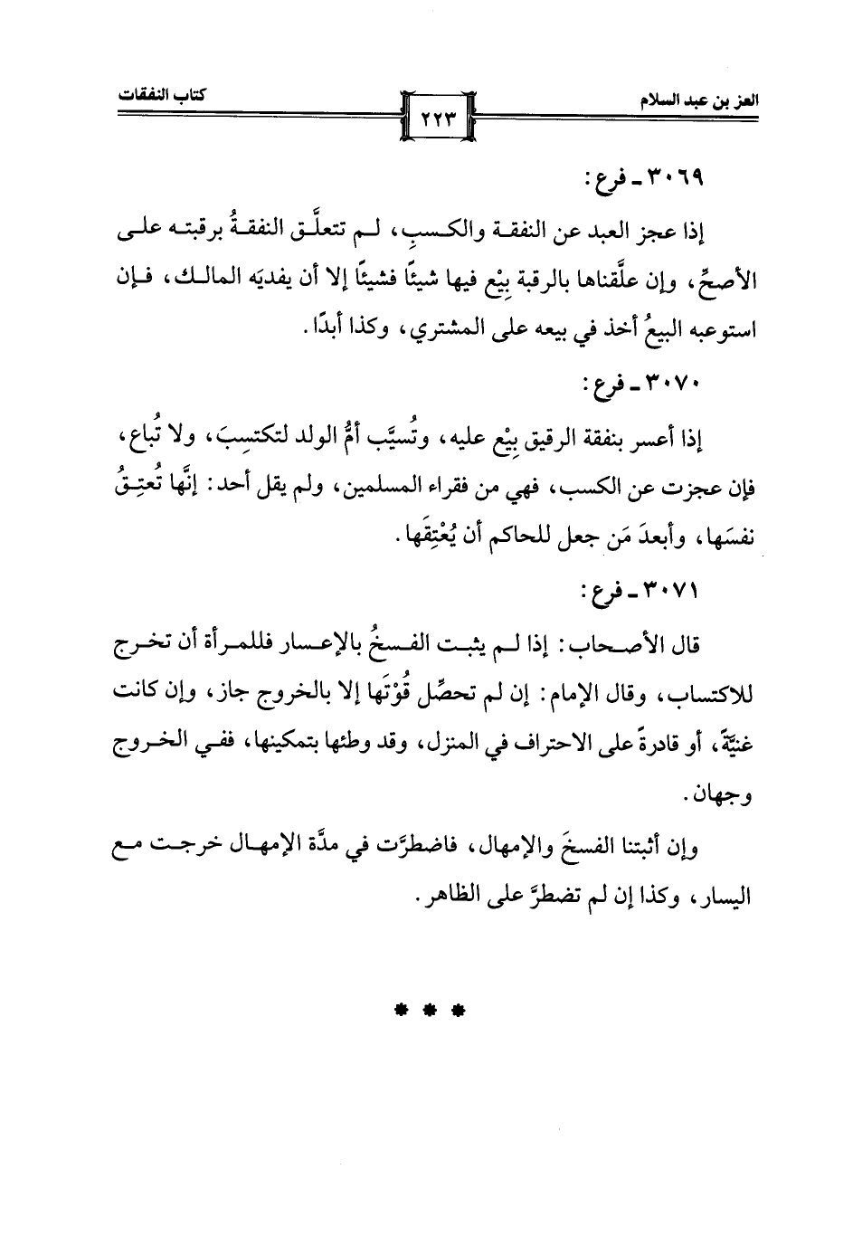 إذا أعسر بنفقة الرقيق بِيع عليه، وتُسيَّب أمُّ الولد لتكتسِبَ، ولا تُباع، فإن عجزت عن الكسب، فهي من فقراء المسلمين، ولم يقل أحد: إنَّها تُعتِقُ نفسَها، وأبعدَ مَن جعل للحاكم أن يُعْتِقَها.