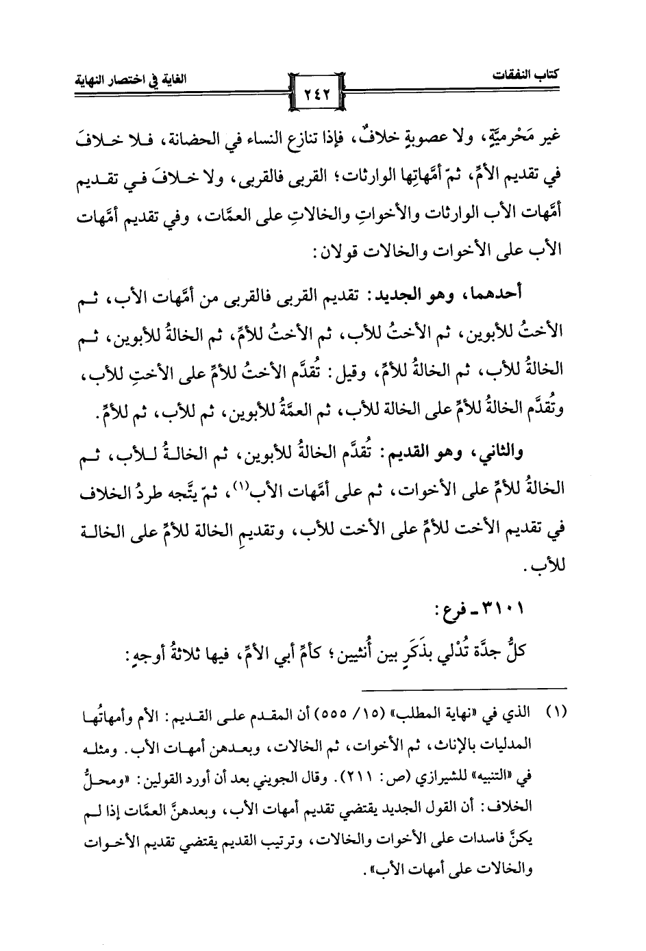 (¬1) الذي في "نهاية المطلب" (15/ 555) أن المقدم على القديم: الأم وأمهاتُها المدليات بالإناث، ثم الأخوات، ثم الخالات، وبعدهن أمهات الأب. ومثله في "التنبيه" للشيرازي (ص: 211). وقال الجويني بعد أن أورد القولين: "ومحلُّ الخلاف: أن القول الجديد يقتضي تقديم أمهات الأب، وبعدهنَّ العمَّات إذا لم يكن فاسدات على الأخوات والخالات، وترتيب القديم يقتضي تقديم الأخوات والخالات على أمهات الأب".