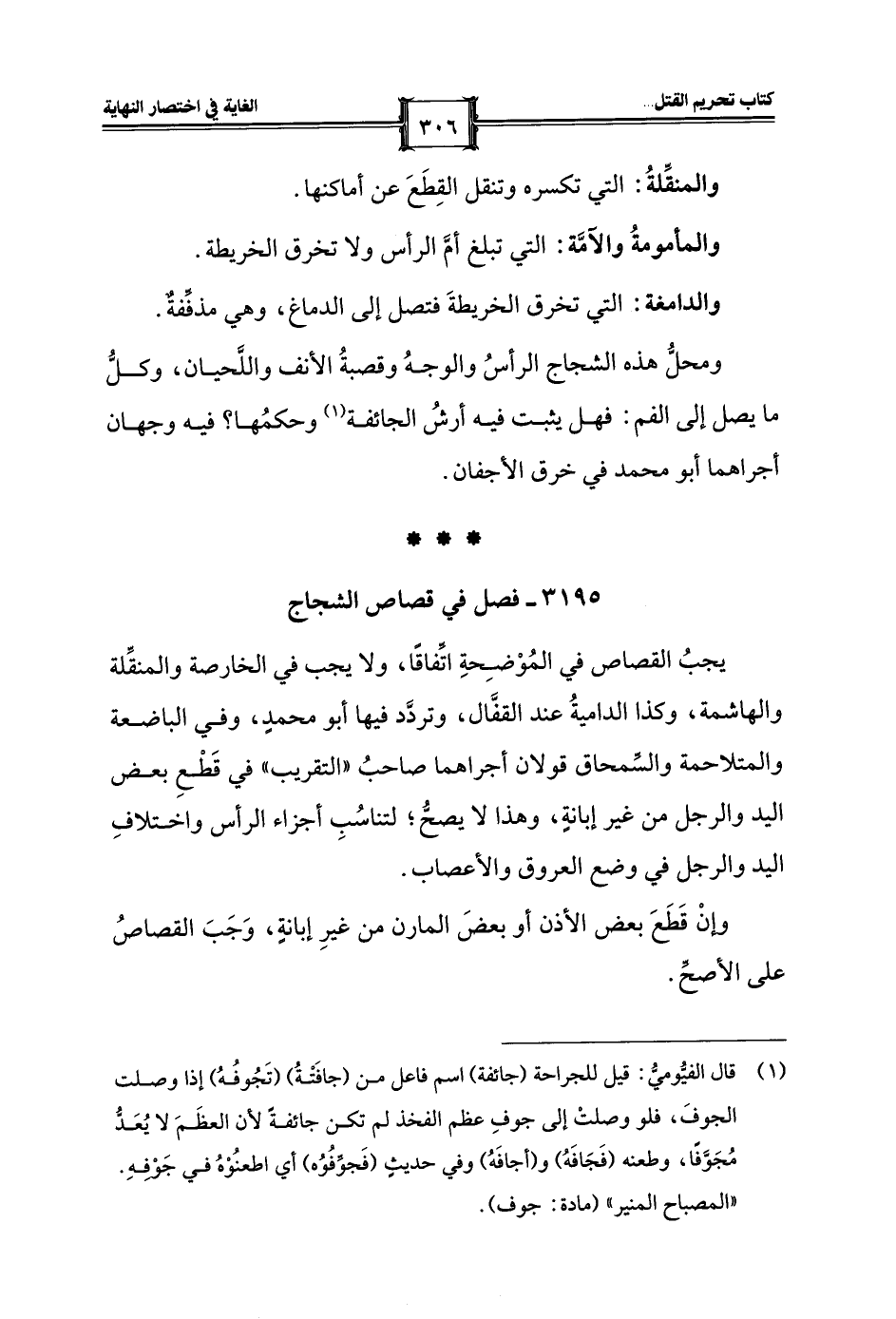 (¬1) قال الفيُّوميُّ: قيل للجراحة (جائفة) اسم فاعل من (جافَتْةُ) (تَجُوفُهُ) إذا وصلت الجوفَ، فلو وصلتْ إلى جوفِ عظم الفخذ لم تكن جائفةً لأن العظَمَ لا يُعَدُّ مُجَوَّفًا، وطعنه (فَجَافَهُ) و (أجافَهُ) وفي حديثٍ (فَجوِّفُوُه) أي اطعنُوْهُ في جَوْفِهِ. "المصباح المنير" (مادة: جوف).