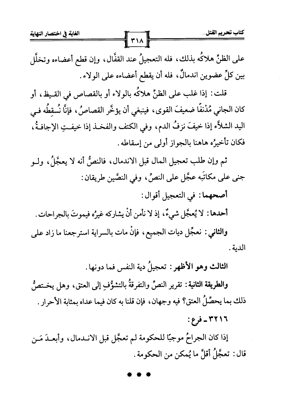 أحدها: لا يُعجَّل شيءٌ، إذ لا نأمن أنْ يشاركه غيرُه فيموتَ بالجراحات.