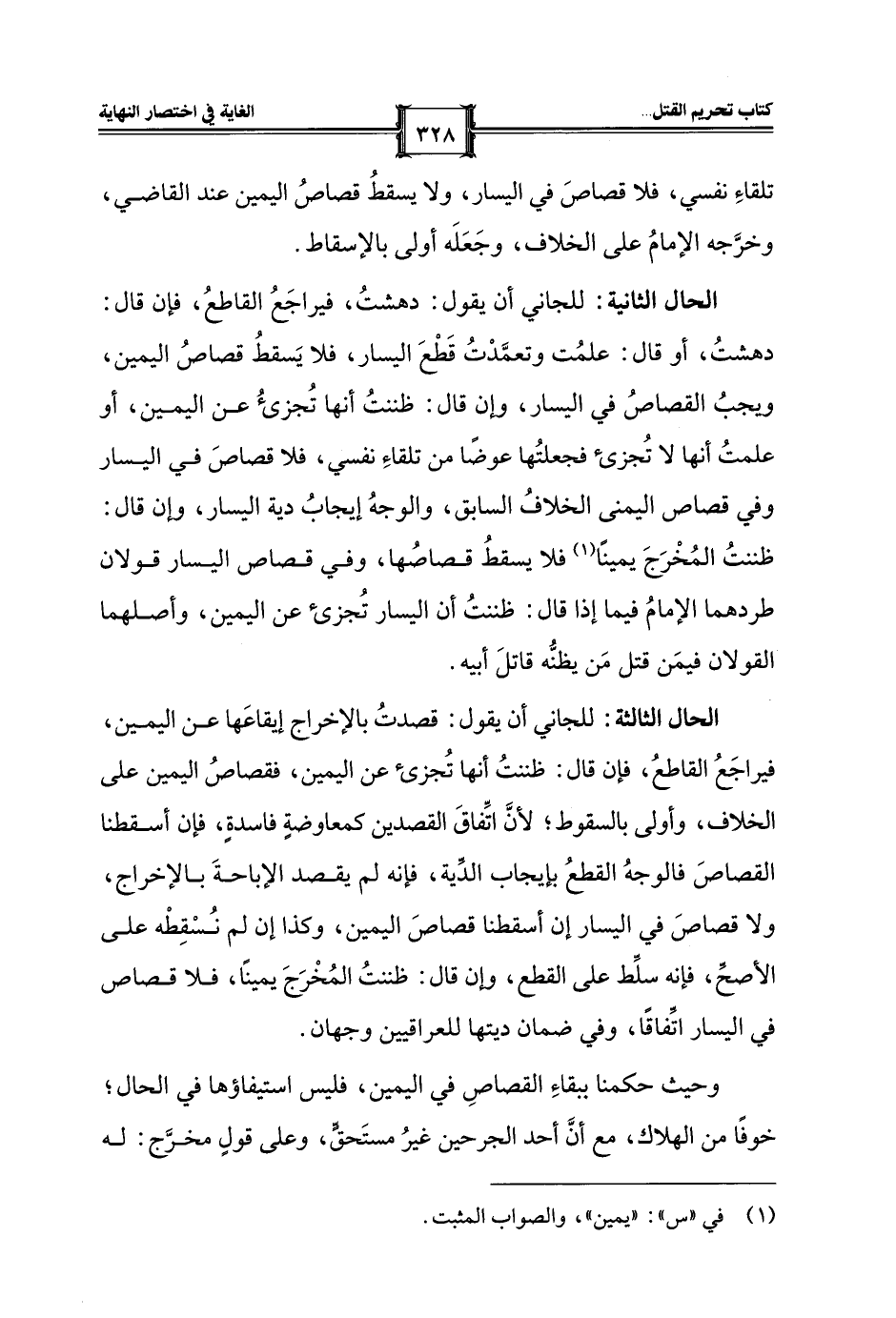 الحال الثانية: للجاني أن يقول: دهشتُ، فيراجَعُ القاطعُ، فإن قال: دهشتُ، أو قال: علمُت وتعمَّدْتُ قَطْعَ اليسار، فلا يَسقطُ قصاصُ اليمين، ويجبُ القصاصُ في اليسار، وإن قال: ظننتُ أنها تُجزئُ عن اليمين، أو علمتُ أنها لا تُجزئ فجعلتُها عوضًا من تلقاءِ نفسي، فلا قصاصَ في اليسار وفي قصاص اليمنى الخلافُ السابق، والوجهُ إيجابُ دية اليسار، وإن قال: ظننتُ المُخْرَجَ يمينًا (¬1) فلا يسقطُ قصاصُها، وفي قصاص اليسار قولان طردهما الإمامُ فيما إذا قال: ظننتُ أن اليسار تُجزئ عن اليمين، وأصلهما القولان فيمَن قتل مَن يظنُّه قاتلَ أبيه.