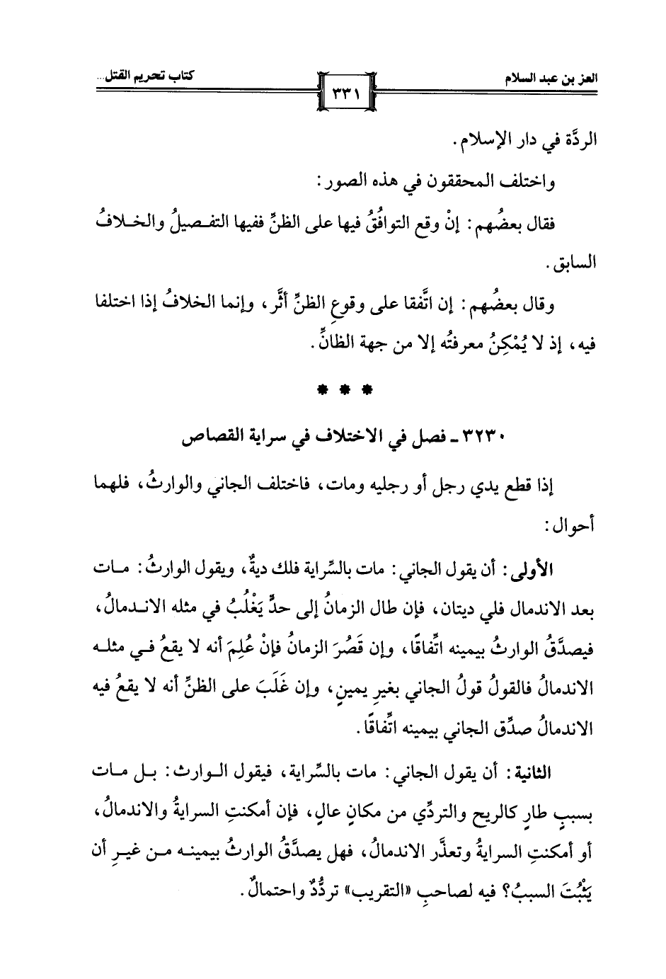 الثانية: أن يقول الجاني: مات بالسِّراية، فيقول الوارث: بل مات بسببٍ طارٍ كالريح والتردِّي من مكانٍ عالٍ، فإن أمكنتِ السرايةُ والاندمالُ، أو أمكنتِ السرايةُ وتعذَّر الاندمالُ، فهل يصدَّقُ الوارثُ بيمينه من غيرِ أن يَثْبُتَ السببُ؟ فيه لصاحبِ "التقريب" تردُّدٌ واحتمالٌ.