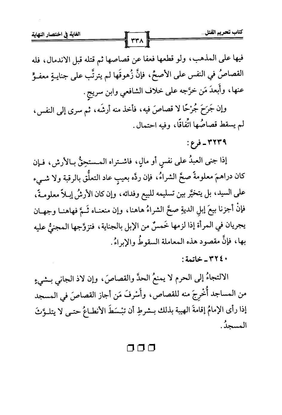 الالتجاءُ إلى الحرم لا يمنعُ الحدَّ والقصاصَ، وإن لاذ الجاني بشيءٍ من المساجد أُخْرِجَ منه للقصاص، وأَسْرفَ مَن أجاز القصاصَ في المسجد إذا رأى الإمامُ إقامةَ الهيبة بذلك بشرطِ أن تبْسَطَ الأنطاعُ حتى لا يتلوَّثَ المسجدُ.