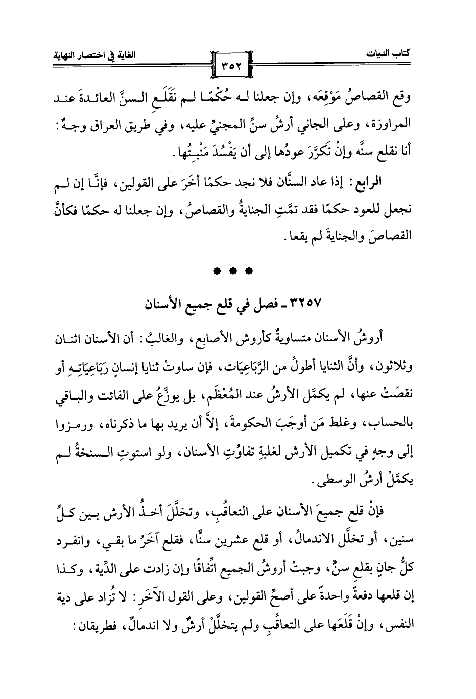 أروشُ الأسنان متساويةٌ كأروش الأصابع، والغالبُ: أن الأسنان اثنان وثلاثون، وأنَّ الثنايا أطولُ من الرَّبَاعِيَات، فإن ساوتْ ثنايا إنسانٍ رَبَاعِيَاتِهِ أو نقصَتْ عنها، لم يكمَّل الأرشُ عند المُعْظَم، بل يوزَّعُ على الفائت والباقي بالحساب، وغلط مَن أوجَبَ الحكومةَ، إلَّا أن يريد بها ما ذكرناه، ورمزوا إلى وجهٍ في تكميل الأرش لغلبةِ تفاوُتِ الأسنان، ولو استوتِ السنخةُ لم يكمَّلْ أرشُ الوسطى.