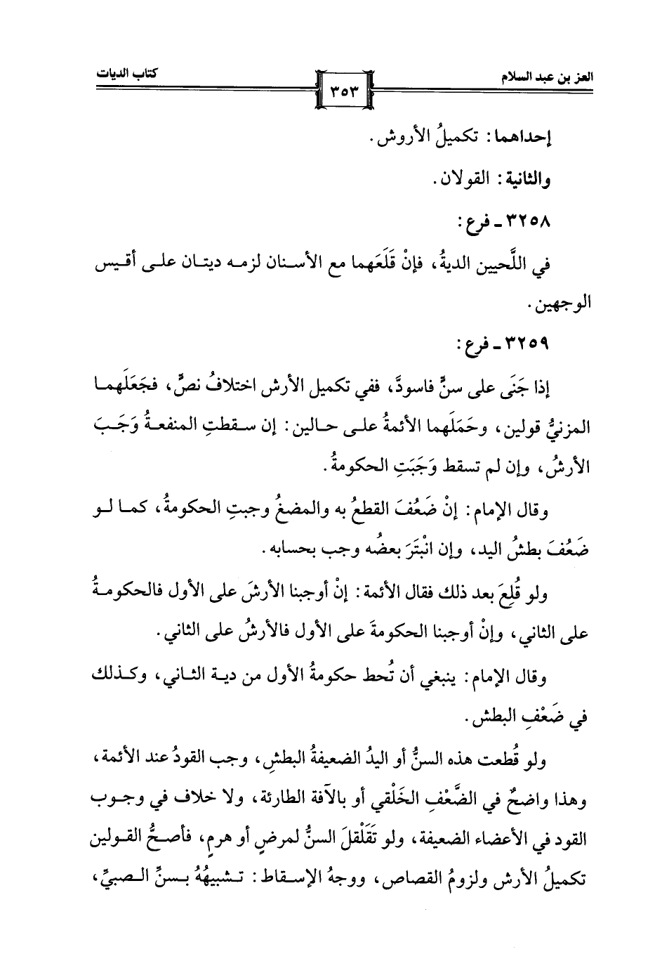 إذا جَنَى على سنٍّ فاسودَّ، ففي تكميل الأرش اختلافُ نصٍّ، فجَعَلَهما المزنيُّ قولين، وحَمَلَهما الأئمةُ على حالين: إن سقطتِ المنفعةُ وَجَبَ الأرشُ، وإن لم تسقط وَجَبَتِ الحكومةُ.