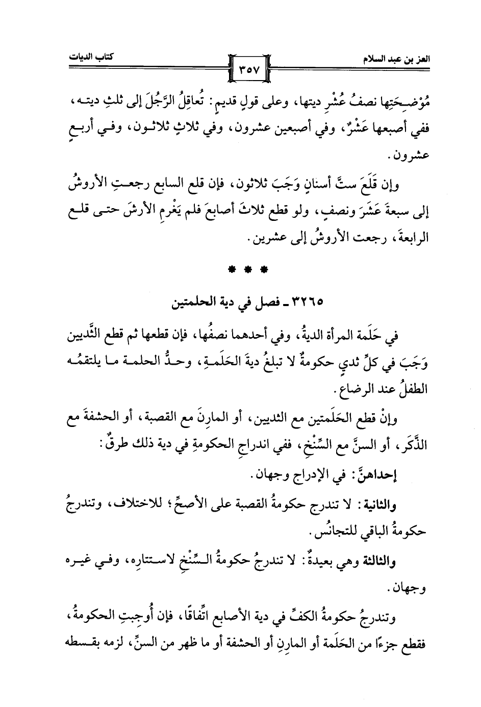 مُوْضِحَتِها نصفُ عُشْرِ ديتها، وعلى قولٍ قديمٍ: تُعاقِلُ الرَّجُلَ إلى ثلثِ ديته، ففي أصبعها عَشْرٌ، وفي أصبعين عشرون، وفي ثلاثٍ ثلاثون، وفي أربعٍ عشرون.