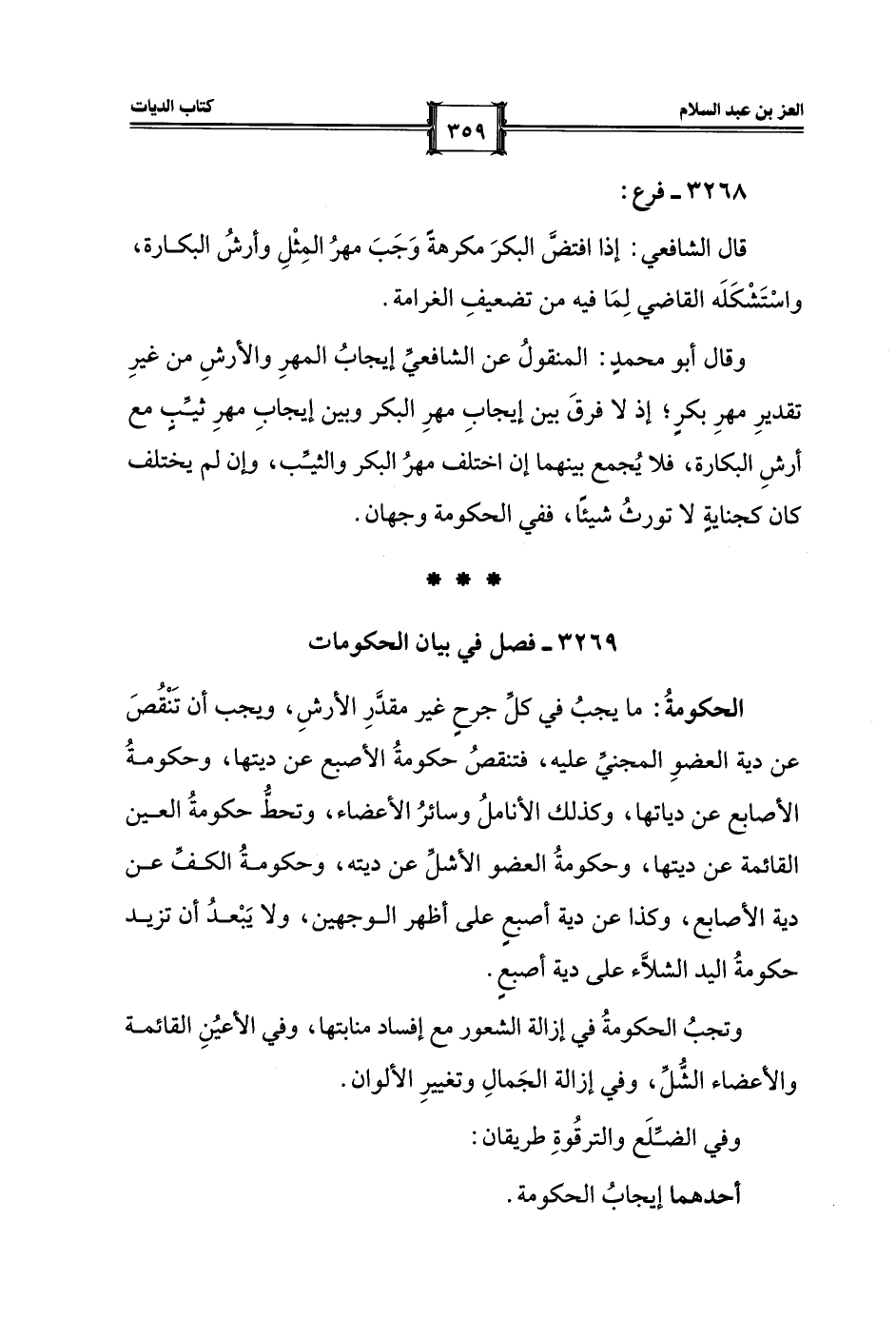 الحكوم: ما يجبُ في كلِّ جرحٍ غير مقدَّرِ الأرشِ، ويجب أن تَنْقُصَ عن دية العضوِ المجنيِّ عليه، فتنقصُ حكومةُ الأصبع عن ديتها، وحكومةُ الأصابع عن دياتها، وكذلك الأناملُ وسائرُ الأعضاء، وتحطُّ حكومةُ العين القائمة عن ديتها، وحكومةُ العضو الأشلِّ عن ديته، وحكومةُ الكفِّ عن دية الأصابع، وكذا عن دية أصبعٍ على أظهر الوجهين، ولا يَبْعدُ أن تزيد حكومةُ اليد الشلَّاء على دية أصبعٍ.