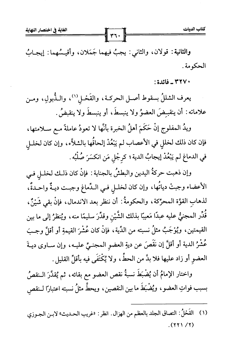 ويدُ المفلوج إنْ حَكَمَ أهلُ الخبرة بأنَّها لا تعودُ عاملةً مع سلامتها، فإن كان ذلك لخللٍ في الأعصاب لم يَبْعُدْ إلحاقُها بالشلَّاء، وإن كان لخللٍ في الدماغ لم يَبْعُدْ إيجابُ الدية، كرِجْلِ مَن انكسَرَ صُلْبُه.