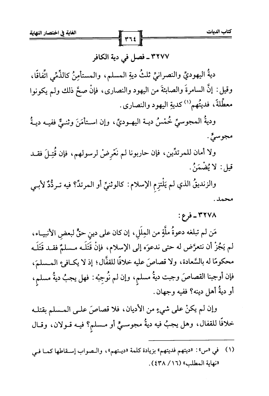 ديةُ اليهوديِّ والنصرانيِّ ثلثُ ديةِ المسلم، والمستأمِنُ كالذّمِّي اتِّفاقًا، وقيل: إنَّ السامرةَ والصابئةَ من اليهود والنصارى، فإنْ صحَّ ذلك ولم يكونوا معطلةً، فديتُهم (¬1) كديةِ اليهود والنصارى.