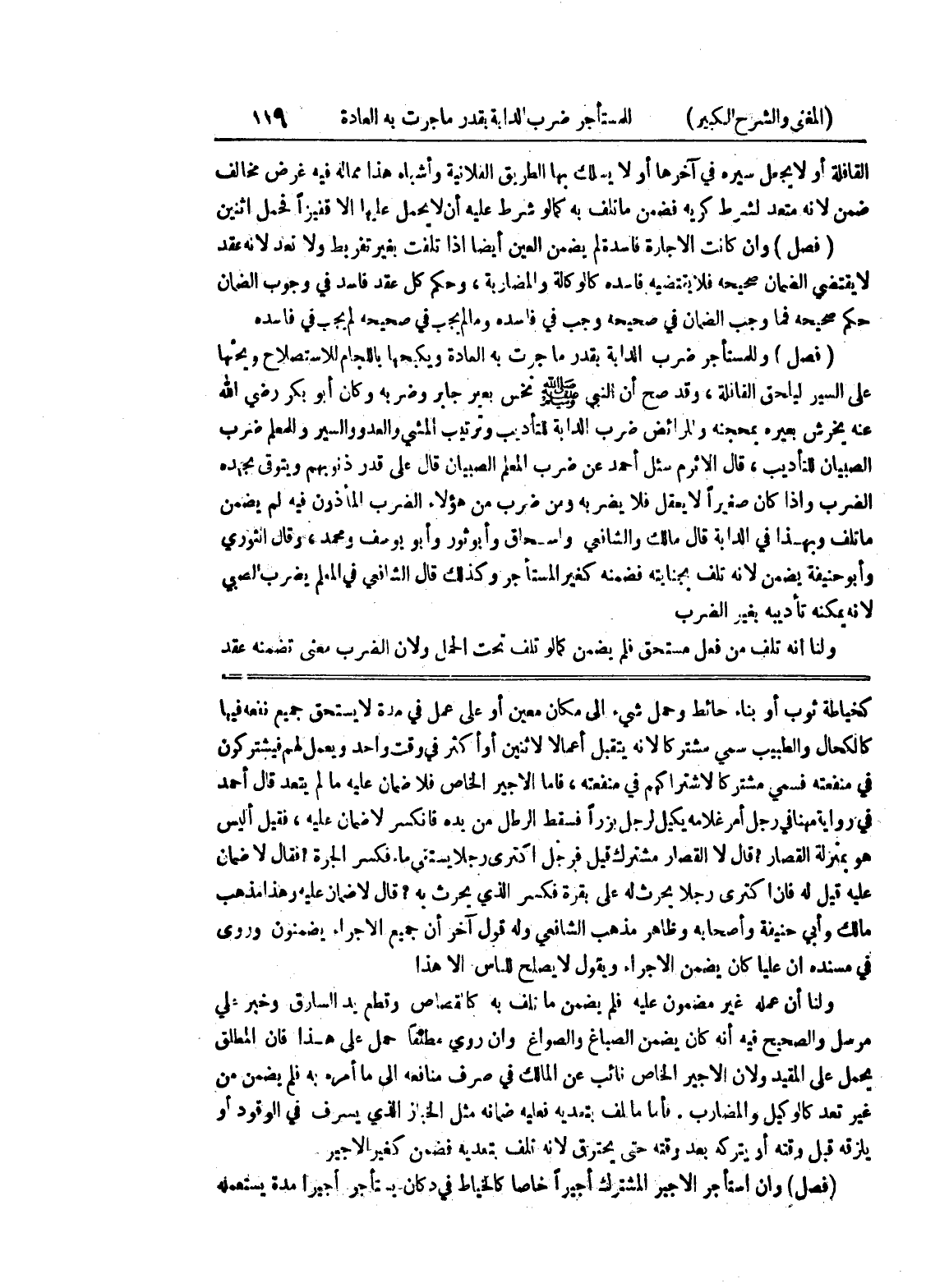 كخياطة ثوب أو بناء حائط وحمل شئ إلى مكان معين أو على عمل في مدة لا يستحق جميع نفعه فيها كالكحال والطبيب سمي مشتركا لأنه يتقبل أعمالا لاثنين أو أكثر في وقت واحد ويعمل لهم فيشتركون في منفعته فسمي مشتركا لاشتراكهم في منفعته، فأما الأجير الخاص فلا ضمان عليه ما لم يتعد قال أحمد في رواية مهنا في رجل أمر غلامه يكيل لرجل بزراً فسقط الرطل من يده فانكسر لا ضمان عليه، فقيل أليس هو بمنزلة القصار؟ قال لا القصار مشترك قيل فرجل اكترى رجلا يستقي ماء فكسر الجرة؟ فقال لا ضمان عليه قيل له فإن اكترى رجلا يحرث له على بقرة فكسر الذي يحرث به؟ قال لا ضمان عليه وهذا مذهب مالك وأبي حنيفة وأصحابه وظاهر مذهب الشافعي وله قول آخر أن جميع الأجراء يضمنون وروى في مسنده أن عليا كان يضمن الأجراء ويقول لا يصلح للناس إلا هذا ولنا أن عمله غير مضمون عليه فلم يضمن ما تلف به كالقصاص وقطع يد السارق وخبر علي مرسل والصحيح فيه أنه كان يضمن الصباغ والصواغ وإن روي مطلقاً حمل على هذا فإن المطلق يحمل على المقيد ولأن الأجير الخاص نائب عن المالك في صرف منافعه إلى ما أمره به فلم يضمن من