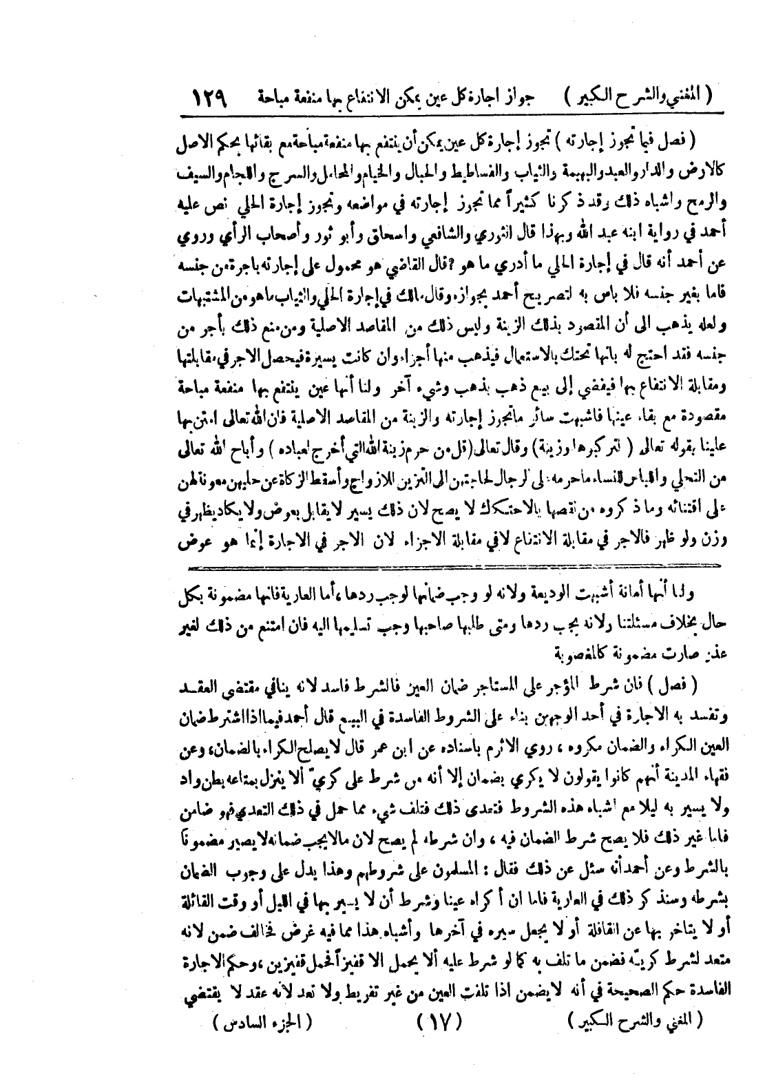 ولنا أنها أمانة أشبهت الوديعة ولأنه لو وجب ضمانها لوجب ردها، أما العارية فإنها مضمونة بكل حال بخلاف مسئلتنا ولأنه يجب ردها ومتى طلبها صاحبها وجب تسليمها إليه فإن امتنع من ذلك لغير عذر صارت مضمونة كالمغصوبة (فصل) فإن شرط المؤجر على المستأجر ضمان العين فالشرط فاسد لأنه ينافي مقتضى العقد وتفسد به الإجارة في أحد الوجهين بناء على الشروط الفاسدة في البيع قال أحمد فيما إذا اشترط ضمان العين الكراء والضمان مكروه، روى الأثرم بإسناده عن ابن عمر قال لا يصلح الكراء بالضمان، وعن فقهاء المدينة أنهم كانوا يقولون لا يكري بضمان إلا أنه من شرط على كري ألا ينزل بمتاعه بطن واد ولا يسير به ليلا مع أشباه هذه الشروط فتعدى ذلك فتلف شئ مما حمل في ذلك التعدي فهو ضامن فأما غير ذلك فلا يصح شرط الضمان فيه، وإن شرطه لم يصح لأن ما لا يجب ضمانه لا يصير مضموناً بالشرط وعن أحمد أنه سئل عن ذلك فقال: المسلمون على شروطهم وهذا يدل على وجوب الضمان بشرطه وسنذكر ذلك في العارية فأما إن أكراه عينا وشرط أن لا يسير بها في الليل أو وقت القائلة أو لا يتأخر بها عن القافلة أو لا يجعل سيره في آخرها وأشباه هذا مما فيه غرض مخالف ضمن لأنه متعد لشرط كريه فضمن ما تلف به كما لو شرط عليه ألا يحمل إلا قفيزاً فحمل قفيزين، وحكم الإجارة