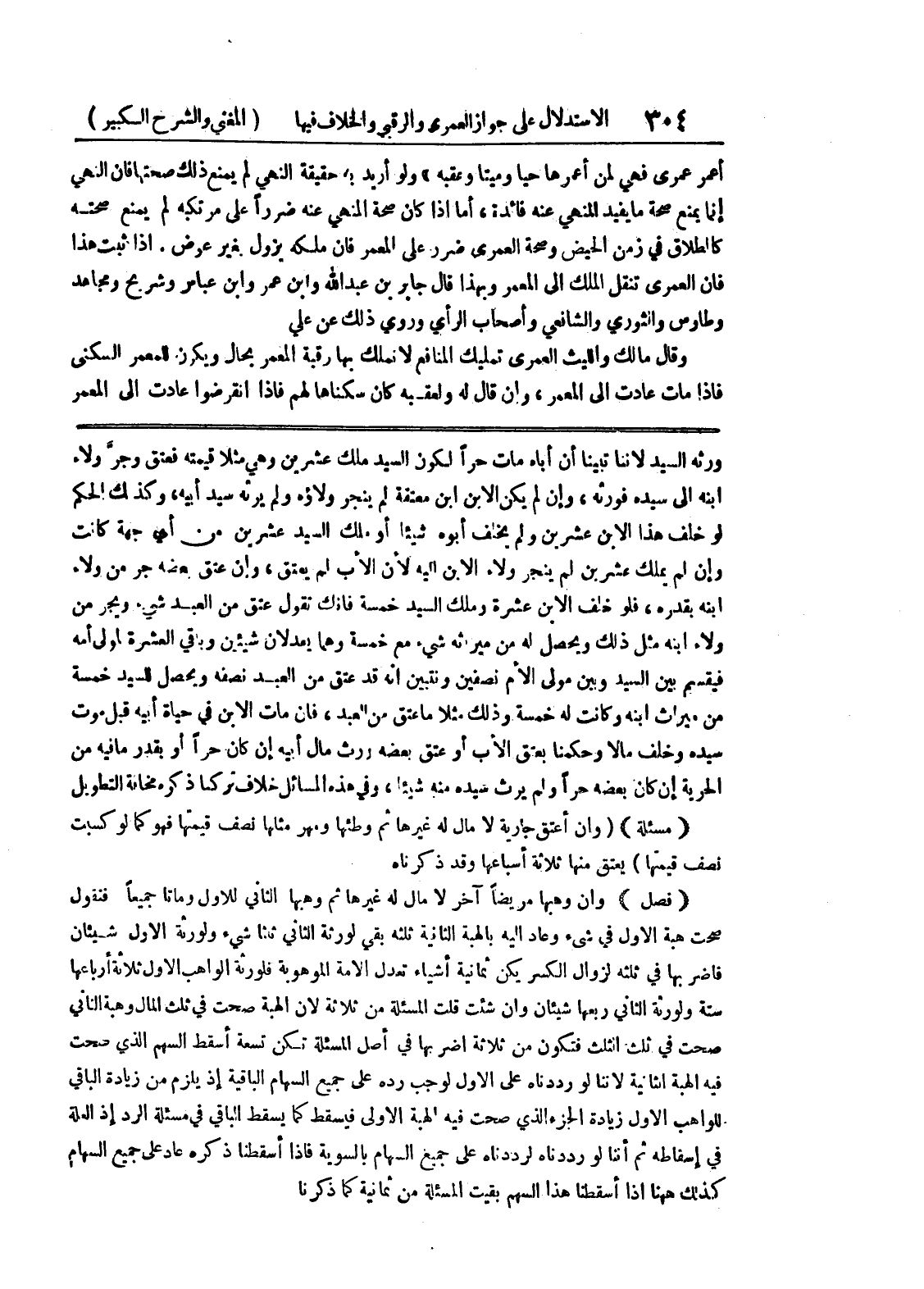 ورثه السيد لأننا تبينا أن أباه مات حراً لكون السيد ملك عشرين وهي مثلا قيمته فعتق وجر ولاء ابنه إلى سيده فورثه، وإن لم يكن الابن ابن معتقه لم ينجر ولاؤه ولم يرثه سيد أبيه، وكذلك الحكم لو خلف هذا الابن عشرين ولم يخلف أبوه شيئاً أو ملك السيد عشرين من أي جهة كانت وإن لم يملك عشرين لم ينجر ولاء الابن إليه لأن الأب لم يعتق، وإن عتق بعضه جر من ولاء ابنه بقدره، فلو خلف الابن عشرة وملك السيد خمسة فإنك تقول عتق من العبد شئ ويجر من ولاء ابنه مثل ذلك ويحصل له من ميراثه شئ مع خمسة وهما يعدلان شيئين وباقي العشرة لمولى أمه فيقسم بين السيد وبين مولى الأم نصفين ونتبين أنه قد عتق من العبد نصفه ويحصل للسيد خمسة من ميراث ابنه وكانت له خمسة وذلك مثلا ما عتق من العبد، فإن مات الابن في حياة أبيه قبل موت سيده وخلف مالاً وحكمنا بعتق الأب أو عتق بعضه ورث مال أبيه ان كان حرا أو بقدر ما فيه من الحرية إن كان بعضه حراً ولم يرث سيده منه شيئاً، وفي هذه المسائل خلا ف تركنا ذكره مخافة التطويل * (مسألة) * (وإن اعتق جارية لا مال له غيرها ثم وطئها ومهر مثلها نصف قيمتها فهو كما لو كسبت نصف قيمتها) يعتق منها ثلاثة أسباعها وقد ذكرناه * (فصل) * وإن وهبها مريضاً آخر لا مال له غيرها ثم وهبها الثاني للأول وماتا جميعاً فنقول صحت هبة الاول في شئ وعاد إليه بالهبة الثانية ثلثه بقي لورثة الثاني ثلثا شئ ولورثة الأول شيئان فاضر بها في ثلثه لزوال الكسر يكن ثمانية أشياء تعدل الأمة الموهوبة فلورثة الواهب الأول ثلاثة أرباعها ستة ولورثة الثاني ربعها شيئان وإن شئت قلت المسألة من ثلاثة لأن الهبة صحت في ثلث المال وهبة الناني صحت في ثلث الثلث فتكون من ثلاثة اضر بها في أصل المسألة تكن تسعة أسقط السهم الذي صحت فيه الهبة الثانية لأننا لو رددناه على الأول لوجب رده على جميع السهام الباقية إذ يلزم من زيادة الباقي للواهب الأول زيادة الجزء الذي صحت فيه الهبة الأولى فيسقط كما يسقط الباقي في مسألة الرد إذ العلة في إسقاطه ثم إننا لو رددناه لرددناه على جميع السهام بالسوية فإذا أسقطنا ذكره عاد على جميع السهام كذلك ههنا إذا أسقطنا هذا السهم بقيت المسألة من ثمانية كما ذكرنا