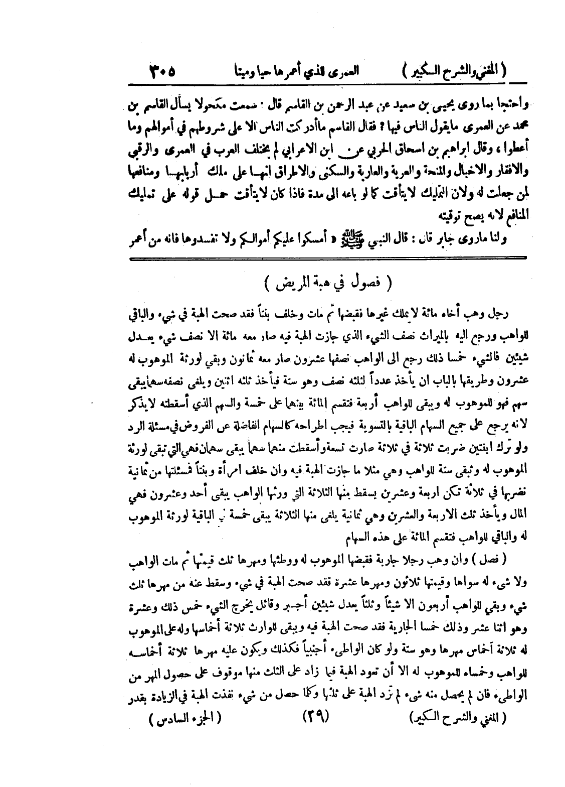 (فصول في هبة المريض) رجل وهب أخاه مائة لا يملك غيرها فقبضها ثم مات وخلف بنتاً فقد صحت الهبة في شئ والباقي للواهب ورجع إليه بالميراث نصف الشئ الذي جازت الهبة فيه صار معه مائة إلا نصف شئ يعدل شيئين فالشئ خمسا ذلك رجع إلى الواهب نصفها عشرون صار معه ثمانون وبقي لورثة الموهوب له عشرون وطريقها بالباب أن يأخذ عدداً لثلثه نصف وهو ستة فيأخذ ثلثه اثنين ويلغى نصفه سهماً يبقى سهم فهو للموهوب له ويبقى للواهب أربعة فتقسم المائة بينهما على خمسة والسهم الذي أسقطته لا يذكر لأنه يرجع على جميع السهام الباقية بالتسوية فيجب إطراحه كالسهام الفاضلة عن الفروض في مسألة الرد ولو ترك ابنتين ضربت ثلاثة في ثلاثة صارت تسعة وأسقطت منهما سهماً يبقى سهمان فهي التي تبقى لورثة الموهوب له وتبقى ستة للواهب وهي مثلاً ما جازت الهبة فيه وإن خلف امرأة وبنتا فمسئلتها من ثمانية نضربها في ثلاثة تكن أربعة وعشرين يسقط منهما الثلاثة التي ورثها الواهب يبقى أحد وعشرون فهي المال ويأخذ ثلث الأربعة والعشرين وهي ثمانية يلغى منها الثلاثة يبقى خمسة في الباقية لورثة الموهوب له والباقي للواهب فتقسم المائة على هذه السهام (فصل) وإن وهب رجلاً جارية فقبضها الموهوب له ووطئها ومهرها ثلث قيمتها ثم مات الواهب ولا شئ له سواها وقيمتها ثلاثون ومهرها عشرة فقد صحت الهبة في شئ وسقط عنه من مهرها ثلث شئ وبقي للواهب أربعون إلا شيئاً وثلثاً يعدل شيئين أجبر وقائل يخرچ الشئ خمس ذلك وعشرة وهو اثنا عشر وذلك خمسا الجارية فقد صحت الهبة فيه ويبقى للوارث ثلاثة أخماسها وله على الموهوب له ثلاثة أخماس مهرها وهو ستة ولو كان الواطئ أجنبياً فكذلك ويكون عليه مهرها ثلاثة أخماسه للواهب وخمساه للموهوب له إلا أن تعود الهبة فيما زاد على الثلث منها موقوف على حصول المهر من الوطئ فان لم يحصل منه شئ لم تزد الهبة على ثلثها وكلما حصل من شئ نفذت الهبة في الزيادة بقدر