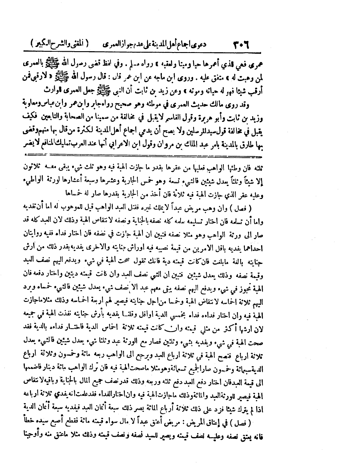 وعليه عقر الذي جازت الهبة فيه ئلاثة فإن أخذ من الجارية بقدرها صار له خمساها (فصل) وإن وهب مريض عبداً لا يملك غيره فقتل العبد الواهب قيل للموهوب له اما ان تفديه وإما أن تسلمه فإن اختار تسلميه سلمه كله نصفه بالجناية ونصفه لانتقاص الهبة وذلك لأن العبد كله قد صار إلى ورثة الواهب وهو مثلا نصفه فتبين أن الهبة جازت في نصفه فإن اختار فداه ففيه روايتان إحداهما يفديه بأقل الأمرين من قيمة نصيبه فيه اوراش جنايته والأخرى يفديه بقدر ذلك من أرش جنايته بالغة ما بلغت فإن كانت قيمته دية فإنك تقول صحت الهبة في شئ ويدفع إليهم نصف العبد وقيمة نصفه وذلك يعدل شيئين فتبين ان الشي نصف العبد وإن كانت قيمته ديتين واختار دفعه فإن الهبة تجوز في شئ ويدفع إليهم نصفه يبقى معهم عبد الا نصف شئ يعدل شيئين فالشئ خمساه ويرد إليهم ثلاثة أخماسه لانتقاض الهبة وخمساً من أجل جنايته فيصير لهم أربعة أخماسه وذلك مثلا ما جازت الهبة فيه وإن اختار فداءه فداه بخمسي الدية أو أقل وقلنا يفديه بأرش جنايته نفذت الهبة في جميعه لأن أرشها أكثر من مثلي قيمته وإن كانت قيمته ثلاثة اخماس الدية فاختار فداءه بالدية فقد صحت الهبة في شئ ويفديه بشئ وثلثين فصار مع الورثة عبد وثلثا شئ يعدل شيئين فالشئ يعدل ثلاثة أرباع فتصح الهبة في ثلاثة أرباع العبد ويرجع إلى الواهب ربعه مائة وخمسون وثلاثة أرباع الدية سبعمائة وخمسون صار الجميع تسعمائة وهو مثلا ما صحت الهبة فيه فإن ترك الواهب مائة دينار فاضممها إلى قيمة العبد فإن اختار دفع العبد دفع ثلثه وربعة وذلك قدر نصف جميع المال بالجناية وباقيه لانتقاص الهبة فيصير للورثة العبد والمائة وذلك ما جازت الهبة فيه وإن اختار الفداء فقد علمت أنه يفدي ثلاثة أرباعه إذا لم يترك شيئاً فزد على ذلك ثلاثة أرباع المائة يصر ذلك سبعة أثمان العبد فيفديه سبعة أثمان الدية (فصل) في إعتاق المريض: مريض أعتق عبداً لا مال سواه قيمته مائة فقطع أصبع سيده خطأ فإنه يعتق نصفه وعليه نصف قيمته ويصير للسيد نصفه ونصف قيمته وذلك مثلا ما عتق منه وأوجبنا