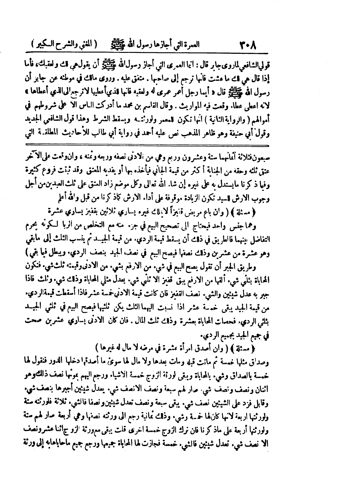 فإن كان الأدنى يساوي عشرين صحت في جميع الجيد بجميع الردئ * (مسألة) * (وإن أصدق امرأة عشرة في مرضه لا مال له غيرها) وصداق مثلها خمسة ثم ماتت قبله ومات بعدها ولا مال لها سوى ما أصدقها دخلها الدور فنقول لها خمسة بالصداق وشئ بالمحاباة ويبقى لورثة الزوج خمسة الأشياء ورجع إليهم بموتها نصف ذلك وهو اثنان ونصف ونصف شي صار لهم سبعة ونصف إلا نصف شئ يعدل شيئين أجبرها بنصف شئ وقابل فزد على الشيئين نصف شئ يبقى سبعة ونصف تعدل شيئين ونصفاً فالشئ ثلاثة فلورثته ستة ولورثتها أربعة لأنها كان لها خمسة وشئ وذلك ثمانية رجع إلى ورثته نصفها وهي أربعة صار لهم ستة ولورثتها أربعة على ما ذكرنا فإن ترك الزوج خمسة أخرى قلت يبقى مع ورثة الزوج اثنا عشر ونصف إلا نصف شئ تعدل شيئين فالشئ خمسة فجازت لها المحاباة جميعها ورجع جميع ما حاباها به إلى ورثة