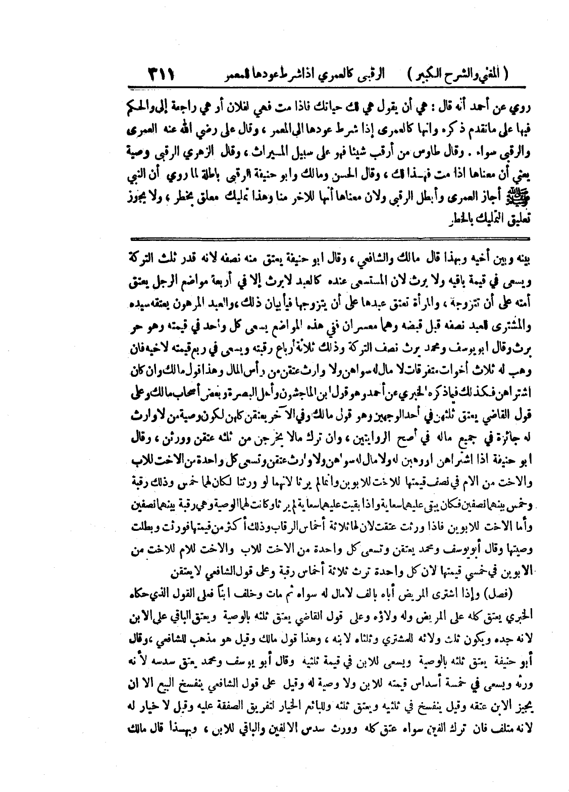 ويسعى في قيمة باقيه ولا يرث لأن المستسعى عنده كالعبد لا يرث إلا في أربعة مواضع الرجل يعتق أمته على أن تتزوجه، والمرأة تعتق عبدها على أن يتزوجها فيأبيان ذلك، والعبد المرهون يعتقه سيده والمشترى للعبد نصفه قبل قبضه وهما معسران ففي هذه المواضع يسعى كل واحد في قيمته وهو حر يرث وقال أبو يوسف ومحمد يرث نصف التركة وذلك ثلاثة أرباع رقبته ويسعى في ربع قيمته لأخيه فإن وهب له ثلاث أخوات متفرقات لا مال له سواهن ولا وارث عتقن من رأس المال وهذا قول مالك وإن كان اشتراهن فكذلك فيما ذكره الخبري عن أحمد وهو قول ابن الماجشون وأهل البصرة وبعض أصحاب مالك وعلى قول القاضي يعتق ثلثهن في أحد الوجهين وهو قول مالك وفي الآخر يعنقن كلهن لكون وصية من لا وارث له جائزة في جميع ماله في أصح الروايتين، وإن ترك مالا يخرجن من ثلثه عتقن وورثن، وقال أبو حنيفة إذا اشتراهن أو وهبن له ولا مال له سواهن ولا وارث عتقن وتسعى كل واحدة من الأخت للأب والأخت من الأم في نصف قيمتها للأخت للأبوين وإنما لم يرثا لانهما لو ورثتا لكان لهما خمس وذلك رقبة وخمس بينهما نصفين فكان يبقى عليهما سعاية وإذا بقيت عليهما سعاية لم يرثا وكانت لهما الوصية وهي رقبة بينهما نصفين وأما الأخت للأبوين فإذا ورثت عتقت لأن لها ثلاثة أخماس الرقاب وذلك أكثر من قيمتها فورثت وبطلت وصيتها وقال أبو يوسف ومحمد يعتقن وتسعى كل واحدة من الأخت للأب والأخت للأم للأخت من الأبوين في خمسي قيمتها لأن كل واحدة ترث ثلاثة أخماس رقبة وعلى قول الشافعي لا يعتقن (فصل) وإذا اشترى المريض أباه بألف لا مال له سواه ثم مات وخلف ابناً فعلى القول الذي حكاه الخبري يعتق كله على المريض وله ولاؤه وعلى قول القاضي يعتق ثلثه بالوصية ويعتق الباقي على الابن لأنه جده ويكون ثلث ولائه للمشتري وثلثاه لابنه، وهذا قول مالك وقيل هو مذهب للشافعي، وقال أبوحينفة يعتق ثلثه بالوصية ويسعى للابن في قيمة ثلثيه وقال أبو يوسف ومحمد يعتق سدسه لأنه ورثه ويسعى في خمسة أسداس قيمته للابن ولا وصية له وقيل على قول الشافعي ينفسخ البيع إلا أن يجيز الابن عتقه وقيل ينفسخ في ثلثيه ويعتق ثلثه وللبائع الخيار لتفريق الصفقة عليه وقيل لا خيار له لأنه متلف فإن ترك ألفين سواه عتق كله وورث سدس الألفين والباقي للابن، وبهذا قال مالك