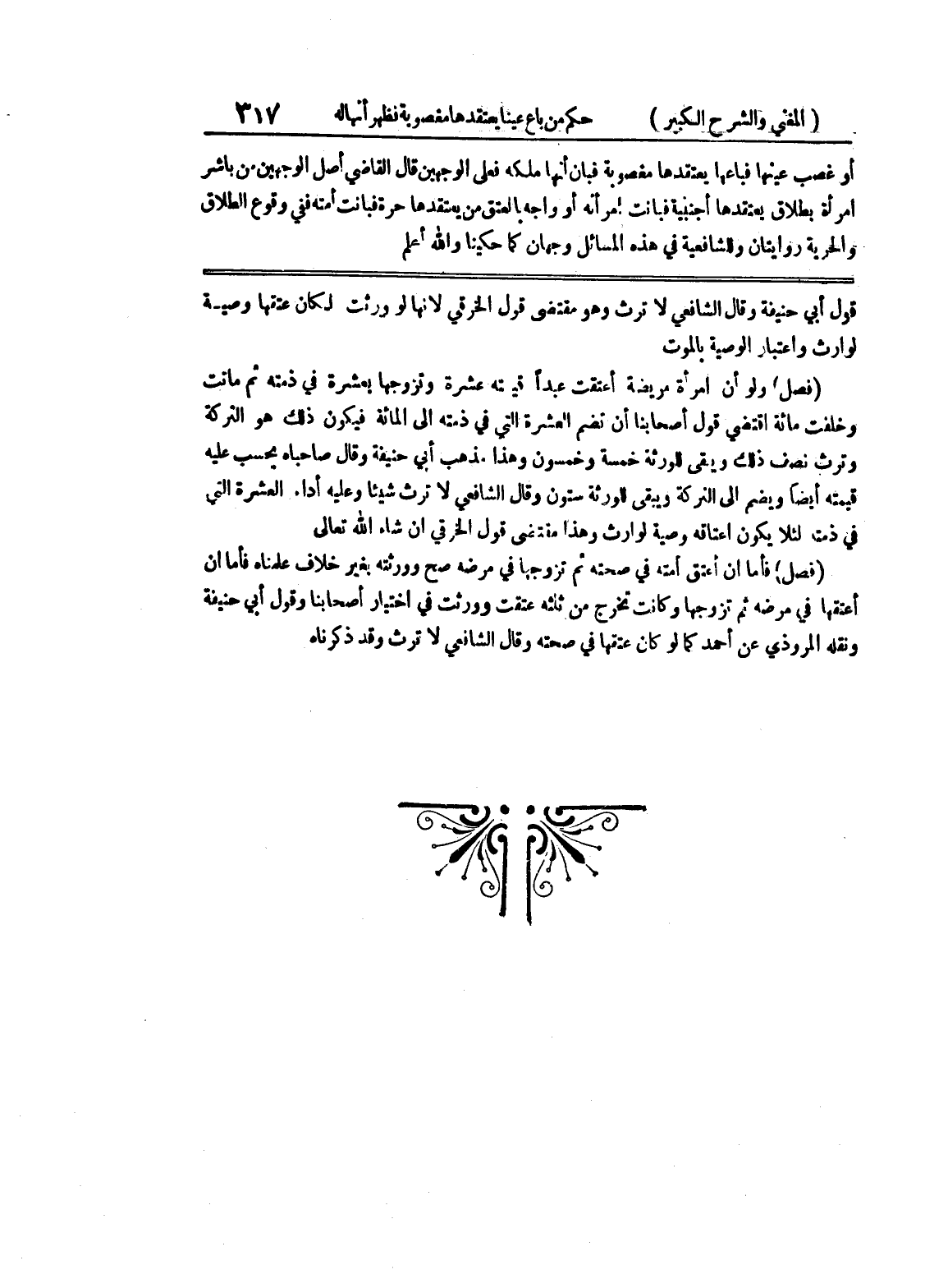 قول أبي حنيفة وقال الشافعي لا ترث وهو مقتضى قول الخرقي لأنها لو ورثت لكان عتقها وصية لوارث واعتبار الوصية بالموت (فصل) ولو أن امرأة مريضة أعتقت عبداً قيمته عشرة وتزوجها بعشرة في ذمته ثم ماتت وخلفت مائة اقتضي قول اصحابنا إن تضم العشرة التي في ذمته إلى المائة فيكون ذلك هو التركة وترث نصف ذلك ويبقى للورثة خسمة وخمسون وهذا مذهب أبي حنيفة وقال صاحباه يحسب عليه قيمته أيضاً ويضم إلى التركة ويبقى للورثة ستون وقال الشافعي لا ترث شيئاً وعليه أداء العشرة التي في ذمته لئلا يكون إعتاقه وصية لوارث وهذا مقتضى قول الخرقي إن شاء الله تعالى (فصل) فأما إن أعتق أمته في صحته ثم تزوجها في مرضه صح وورثته بغير خلاف علمناه فأما إن أعتقها في مرضه ثم تزوجها وكانت تخرج من ثلثه عتقت وورثت في اختيار أصحابنا وقول أبي حنيفة ونقله المروذي عن أحمد كما لو كان عتقها في صحته وقال الشافعي لا ترث وقد ذكرناه