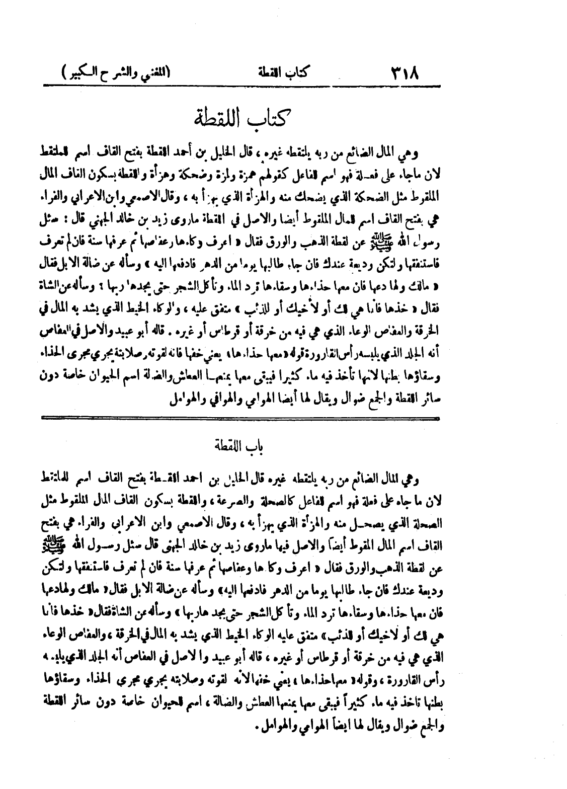 باب اللقطة وهي المال الضائع من ربه يلتقطه غيره قال الخليل بن أحمد اللقطة بفتح القاف اسم للملتقط لان ما جاه على فعلة فهو اسم لفاعل كالصحلة والصرعة، واللقطة بسكون القاف المال الملقوط مثل الصحلة الذي يصحل منه والهزأة الذي يهزأ به، وقال الاصمعي وابن الاعرابي والفراء هي بفتح القاف اسم المال المقوط أيضاً والأصل فيها ما روى زيد بن خالد الجهني قال سئل رسول الله صلى الله عليه وسلم عن لقطة الذهب والورق فقال " اعرف وكاها وعفاصها ثم عرفها سنة فإن لم تعرف فاستنفقها ولتكن وديعة عندك فإن جاء طالبها يوماً من الدهر فادفعها إليه " وسأله عن ضالة الإبل فقال " مالك ولها دعها فإن معها حذاءها وسقاءها ترد الماء وتأكل الشجر حتى يجدها ربها " وسأله عن الشاة فقال " خذها فانا هي لك أو لأخيك أو للذئب " متفق عليه الوكاء الخيط الذي يشد به المال في الخرقة، والعفاص الوعاء الذي هي فيه من خرقة أو قرطاس أو غيره، قاله أبو عبيد والأصل في العفاص أنه الجلد الذي يلبسه