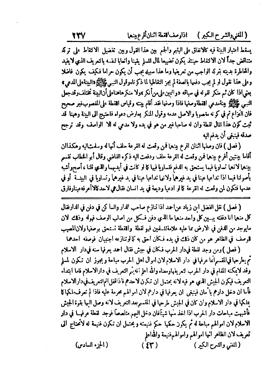 (فصل) نقل الفضل ابن زياد عن أحمد إذا تنازع صاحب الدار والساكن في دفن في الدار فقال كل منهما أنا دفنته يبين كل واحد منهما ما الذي دفن فكل من أصاب الوصف فهو له وذلك لأن ما يوجد من الدفن في الأرض مما عليه علامة المسلمين فهو لقطة واللقطة تستحق بوصفها ولأن المصيب للوصف في الظاهر هو من كان ذلك في يده فكان أحق به كما لو تنازعه أجنبيان فوصفه أحدهما (فصل) ومن وجد لقطة في دار الحرب فكان في جيش فقال أحمد يعرفها سنة في دار الإسلام ثم يطرحها في المقسم إنما عرفها في دار الإسلام لأن أموال أهل الحرب مباحة ويجوز أن تكون لمسلم وقد لا يمكنه المقام في دار الحرب لتعريفها ومعناه والله أعلم أنه يتم التعريف في دار الإسلام فأما ابتداء التعريف فيكون الجيش الذي هو فيه لأنه يحتمل أن تكون لأحدهم فإذا قفل أتم التعريف في دار الإسلام فأما إن دخل دارهم بأمان فينبغي أن يعرفها في دارهم لأن أموالهم محرمة عليه فإذا لم تعرف ملكها كما يملكها في دار الإسلام وإن كان في الجيش طرحها في المقسم بعد التعريف لأنه وصل إليها بقوة الجيش فأشبهت مباحات دار الحرب إذا أخذ منها شيئاً فإن دخل إليهم متلصصاً فوجد لقطة عرفها في دار الإسلام لأن أموالهم مباحة له ثم يكون حكمها حكم غنيمته ويحتمل أن تكون غنيمة له لا تحتاج إلى تعريف لان الظاهر انما أموالهم وأموالهم غنيمة والله أعلم