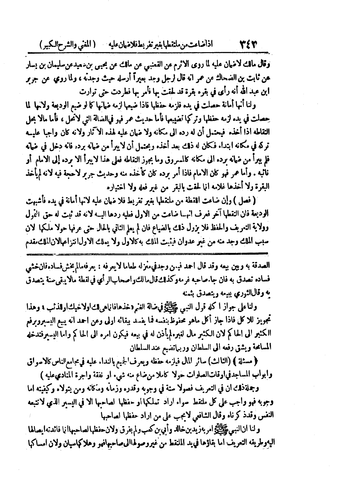 المسامحة ويشق رفعه إلى السلطان وربما تضيع عند السلطان * (مسألة) * (الثالث) سائر المال فيلزمه حفظه ويعرف الجميع بالنداء عليه في مجامع الناس كالأسواق وأبواب المساجد في أوقات الصلوات حولاً كاملاً من ضاع منه شئ أو نفقة وأجرة المتادي عليه) وجملة ذلك أن في التعريف فصولاً ستة في وجوبه وقدره وزمانه ومكانه ومن يتولاه وكيفيته أما وجوبه فهو واجب على كل ملتقط سواء أراد تملكها أو حفظها لصاحبها إلا في اليسير الذي لا تتبعه النفس وقد ذكرناه وقال الشافعي لا يجب على من أراد حفظها لصاحبها ولنا أن النبي صلى الله عليه وسلم أمر به زيد بن خالد وأبي بن كعب ولم يفرق ولأن حفظها لصاحبها إنما فائدته إيصالها إليه وطريقه التعريف إما بقاؤها في يد الملتقط من غير وصولها إلى صاحبها فهو وهلاكها سيان ولأن إمساكها