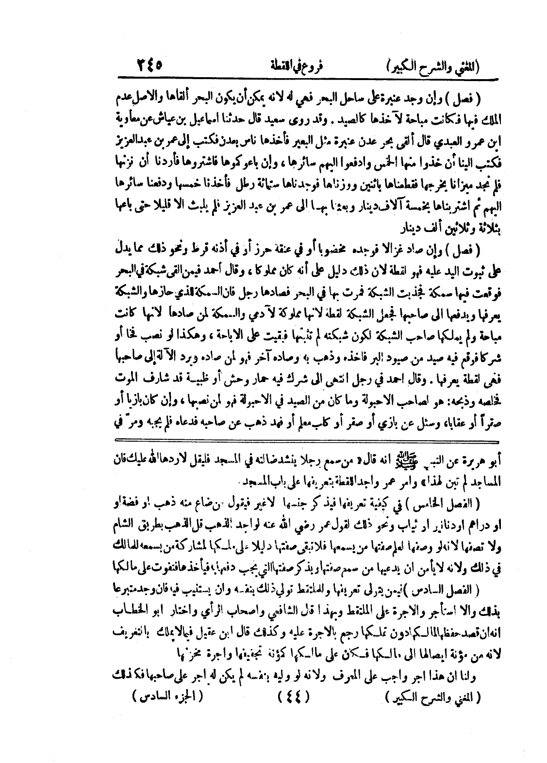 أبو هريرة عن النبي صلى الله عليه وسلم أنه قال " من سمع رجلاً ينشد ضالته في المسجد فليقل لا ردها الله عليك فإن المساجد لم تبن لهذا " وأمر عمر واجد اللقطة بتعريفها على باب المسجد (الفصل الخامس) في كيفية تعريفها فيذكر جنسها لا غير فيقول من ضاع منه ذهب أو فضة أو أو دراهم أو دنانير أو ثياب ونحو ذلك لقول عمر رضي الله عنه لواجد الذهب قل الذهب بطريق الشام ولا تصفها لأنه لو وصفها لعلم صفتها من يسمعها فلا تبقى صفتها دليلاً على ملكها لمشاركة من يسمعه للمالك