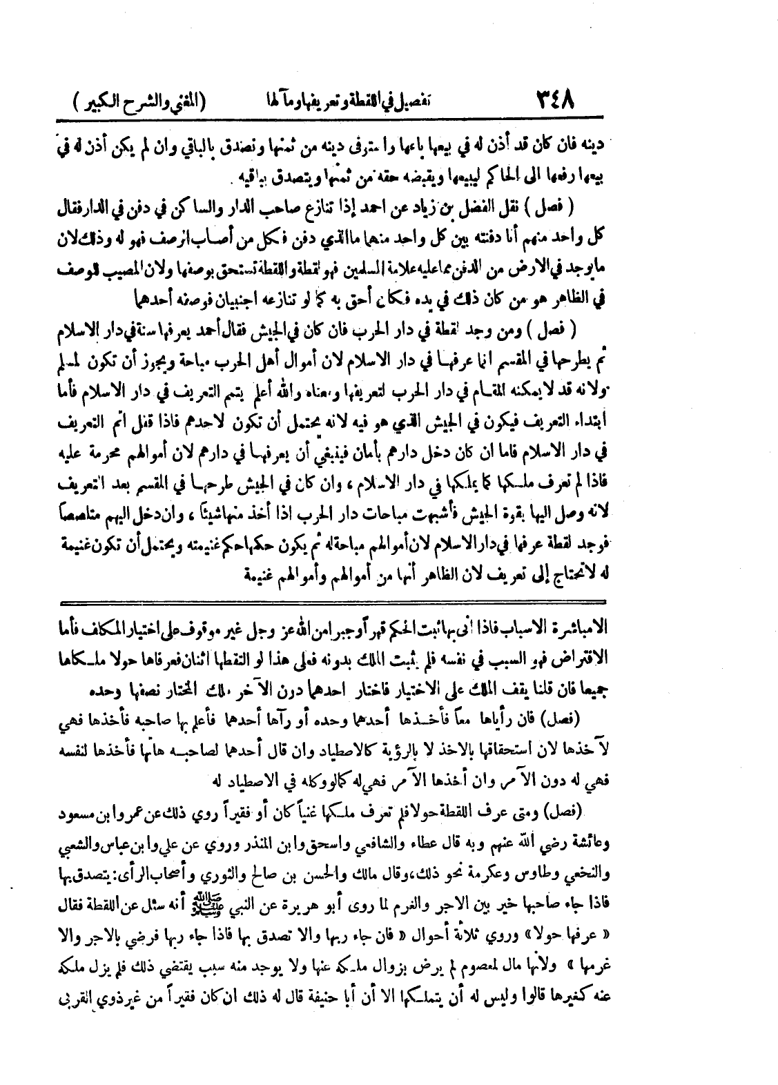 إلا مباشرة الأسباب فإذا انى بها ثيت الحكم قهراً وجبراً من الله عزوجل غير موقوف على اختيار المكلف فأما الاقتراض فهو السبب في نفسه فلم يثبت الملك بدونه فعلى هذا لو التقطها اثنان فعرفاها حولاً ملكاها جميعاً فإن قلنا يقف الملك على الاختيار فاختار أحدهما دون الآخر ملك المختار نصفها وحده (فصل) فإن رأياها معاً فأخذها أحدهما وحده أو رآها أحدهما فأعمل بها صاحبه فأخذها فهي لآخذها لأن استحقاقها بالأخذ لا بالرؤية كالاصطياد وإن قال أحدهما لصاحبه هاتها فأخذها لنفسه فهي له دون الآمر وإن أخذها الآمر فهي له كما لو وكله في الاصطياد له (فصل) ومتى عرف اللقطة حولاً فلم تعرف ملكها غنياً كان أو فقيراً روى ذلك عن عمرو ابن مسعود وعائشة رضي الله عنهم وبه قال عطاء والشافعي واسحق وابن المنذر وروي عن علي وابن عباس والشعبي والنخعي وطاوس وعكرمة نحو ذلك، وقال مالك والحسن بن صالح والثوري وأصحاب الرأي: يتصدق بها فإذا جاء صاحبها خير بين الأجر والغرم لما روى أبو هريرة عن النبي صلى الله عليه وسلم أنه سئل عن اللقطة فقال
