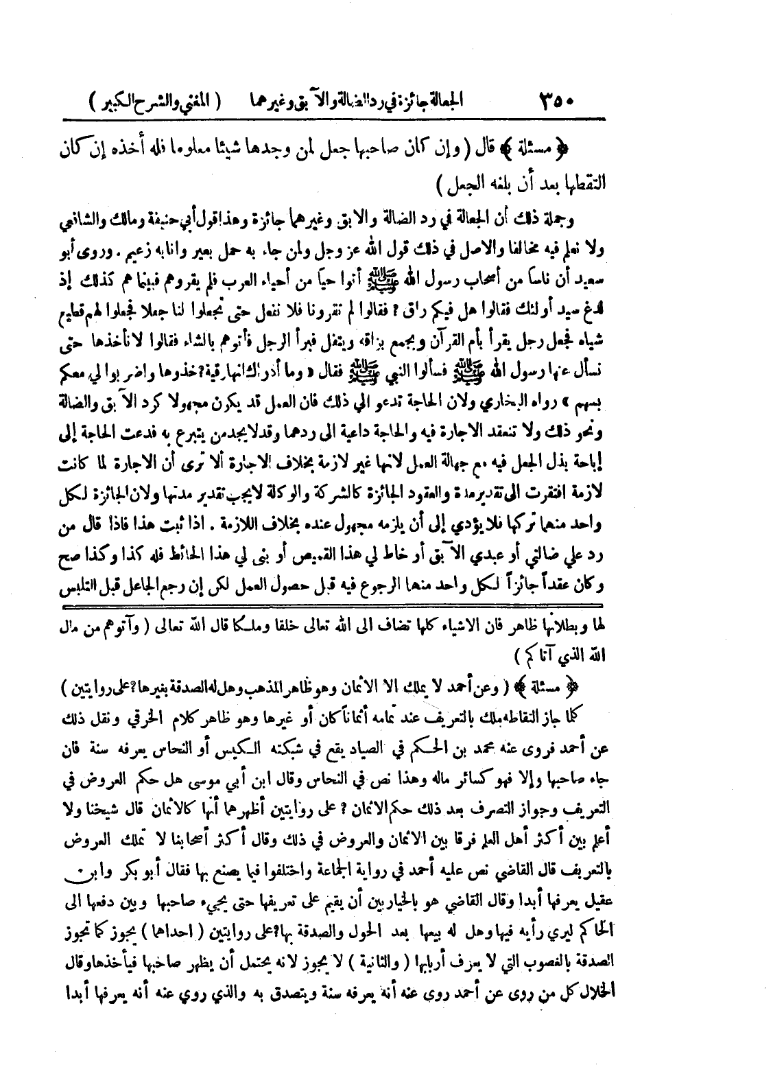 لها وبطلانها ظاهر فإن الأشياء كلها تضاف إلى الله تعالى خلقاً وملكاً قال الله تعالى (وآتوهم من مال الله الذي آتاكم) * (مسألة) * (وعن أحمد لا يملك إلا الأثمان وهو ظاهر المذهب وهل له الصدقة بغيرها؟ على روايتين) كلما جاز التقاطه ملك بالتعريف عند تمامه أثماناً كان أو غيرها وهو ظاهر كلام الخرقي ونقل ذلك عن أحمد فروى عنه محمد بن الحكم في الصياد يقع في شبكته الكيس أو النحاس يعرفه سنة فإن جاء صاحبها وإلا فهو كسائر ماله وهذا نص في النحاس وقال ابن أبي موسى هل حكم العروض في التعريف وجواز التصرف بعد ذلك حكم الأثمان؟ على روايتين أظهرهما أنها كالأثمان قال شيخنا ولا أعلم بين أكثر أهل العلم فرقاً بين الأثمان والعروض في ذلك وقال أكثر أصحابنا لا تملك العروض