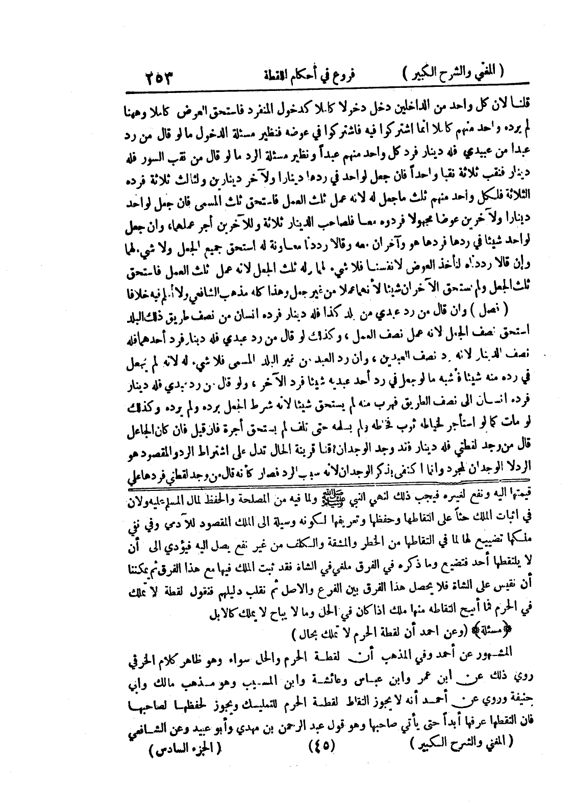قيمتها إليه ونفع لغيره فيجب ذلك لنهي النبي صلى الله عليه وسلم ولما فيه من المصلحة والحفظ لمال المسلم عليه ولأن في إثبات الملك حثاً على التقاطها وحفظها وتعريفها لكونه وسيلة إلى الملك المقصود للآدمي وفي نفي ملكها تضييع لها لما في التقاطها من الخطر والمشقة والكلف من غير نفع يصل إليه فيؤدي الى أن لا يلتقطها أحد فتضيع وما ذكره في الفرق ملغي في الشاة فقد ثبت الملك فيها مع هذا الفرق ثم يمكننا أن نقيس على الشاة فلا يحصل هذا الفرق بين الفرع والأصل ثم نقلب دليلهم فنقول لقطة لا تملك في الحرم فما أبيح التقاطه منها ملك إذا كان في الحل وما لا يباح لا يملك كالإبل * (مسألة) * (وعن أحمد أن لقطة الحرم لا تملك بحال) المشهور عن أحمد وفي المذهب أن لقطة الحرم والحل سواء وهو ظاهر كلام الخرقي روى ذلك عن ابن عمر وابن عباس وعائشة وابن المسيب وهو مذهب مالك وابي حنيفة وروى عن أحمد أنه لا يجوز التقاط لقطة الحرم للتمليك ويجوز لحفظها لصاحبها فإن التقطها عرفا أبداً حتى يأتي صاحبها وهو قول عبد الرحمن بن مهدي وأبو عبيد وعن الشافعي