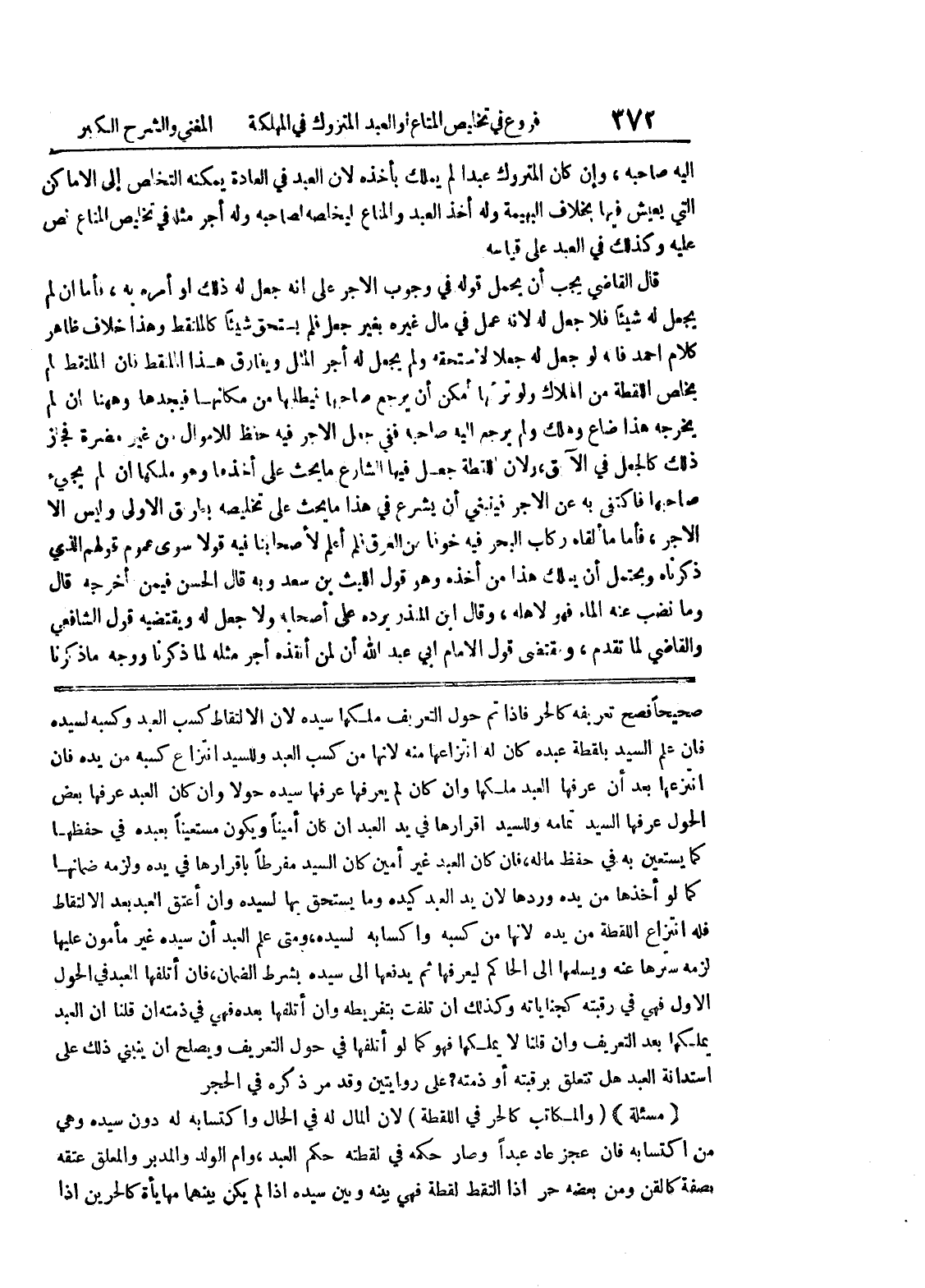 استدانة العبد هل تتعلق برقبته أو ذمته؟ على روايتين وقد مر ذكره في الحجر * (مسألة) * (والمكاتب كالحر في اللقطة) لأن المال له في الحال واكتسابه له دون سيده وهي من اكتسابه فإن عجز عاد عبدا وصار حكمه في لقطته حكم العبد، وأم الولد والمدبر والمعلق عتقه بصفة كالقن ومن بعضه حر إذا التقط لقطة فهي بينه وبين سيده إذا لم يكن بينهما مهايأة كالحرين إذا