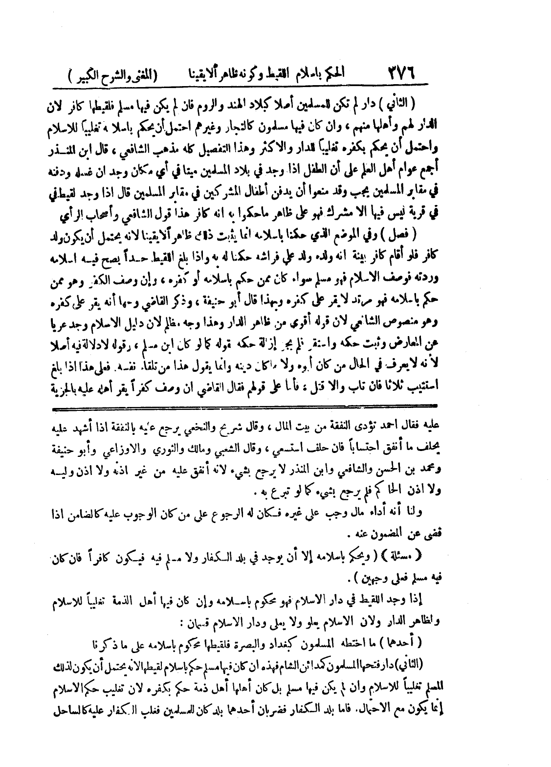 إذا وجد اللقيط في دار الإسلام فهو محكوم بإسلامه وإن كان فيها أهل الذمة تغليباً للإسلام ولظاهر الدار ولأن الإسلام يعلو ولا يعلى ودار الإسلام قسمان: (أحدهما) ما اختطه المسلمون كبغداد والبصرة فلقيطها محكوم بإسلامه على ما ذكرنا (الثاني) دار فتحها المسلمون كمدائن الشام فهذه إن كان فيها مسلم حكم بإسلام لقيطها لأنه يحتمل أن يكون لذلك المسلم تغليباً للإسلام وإن لم يكن فيها مسلم بل كان أهلها أهل ذمة حكم بكفره لأن تغليب حكم الإسلام إنما يكون مع الاحتمال.