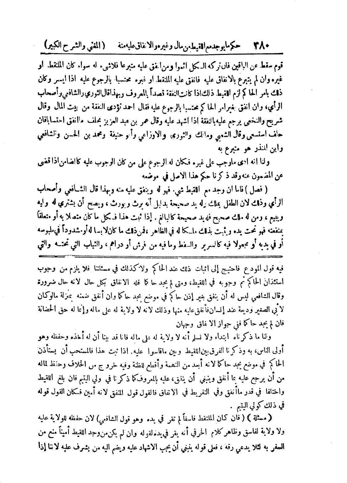فيه قول المدوع فاحتيج إلى إثبات ذلك عند الحاكم ولا كذلك في مسئلتنا فلا يلزم من وجوب استئذان الحاكم ثم وجوبه في اللقيط، ومتى لم يجد حاكماً فله الإنفاق بكل حال لأنه حال ضرورة وقال الشافعي ليس له أن ينفق بغير إذن حاكم في موضع يجد حاكماً وإن أنفق ضمنه بمنزلة ما لو كان لأبي الصغير وديعة عند إنسان فأنفق عليه منها وذلك لأنه لا ولاية له على ماله وإنما له حق الحضانة فان لم يجد حاكماً ففي جواز الإنفاق وجهان ولنا ما ذكرناه ابتداء ولا نسلم أنه لا ولاية له على ماله فإنا قد بينا أن له أخذه وحفظه وهو أولى الناس، به وذكرنا الفرق بين اللقيط وبين ما قاسوا عليه.