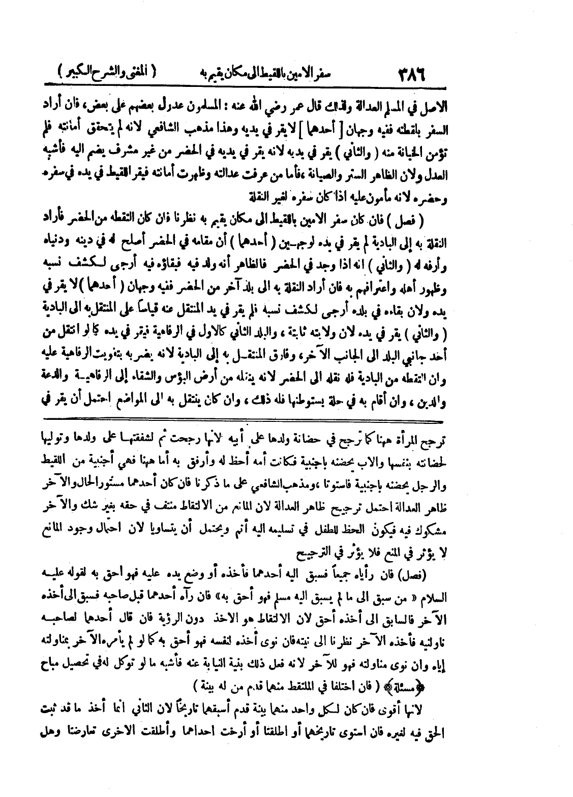 ترجح المرأة ههنا كما ترجح في حضانة ولدها على أبيه لأنها رجحت ثم لشفقتها على ولدها وتوليها لحضانته بنفسها والأب يحضنه بأجنبية فكانت أمه أحظ له وأرفق به أما ههنا فهي أجنبية من اللقيط والرجل يحضنه بأجنبية فاستوتا، ومذهب الشافعي على ما ذكرنا فإن كان أحدهما مستور الحال والآخر ظاهر العدالة احتمل ترجيح ظاهر العدالة لأن المانع من الالتقاط منتف في حقه بغير شك والآخر مشكوك فيه فيكون الحظ للطفل في تسليمه إليه أتم ويحتمل أن يتساويا لأن احتمال وجود المانع لا يؤثر في المنع فلا يؤثر في الترجيح (فصل) فإن رأياه جميعاً فسبق إليه أحدهما فأخذه أو وضع يده عليه فهو أحق به لقوله عليه السلام " من سبق إلى ما لم يسبق إليه مسلم فهو أحق به " فإن رآه أحدهما قبل صاحبه فسبق إلى أخذه الآخر فالسابق إلى أخذه أحق لأن الالتقاط هو الأخذ دون الرؤية فإن قال أحدهما لصاحبه ناولنيه فأخذه الآخر نظرنا إلى نيته فإن نوى أخذه لنفسه فهو أحق به كما لو لم يأمره الآخر بمناولته إياه وإن نوى مناولته فهو للآخر لأنه فعل ذلك بنية النيابة عنه فأشبه ما لو توكل له في تحصيل مباح * (مسألة) * (فإن اختلفا في الملتقط منهما قدم من له بينة)