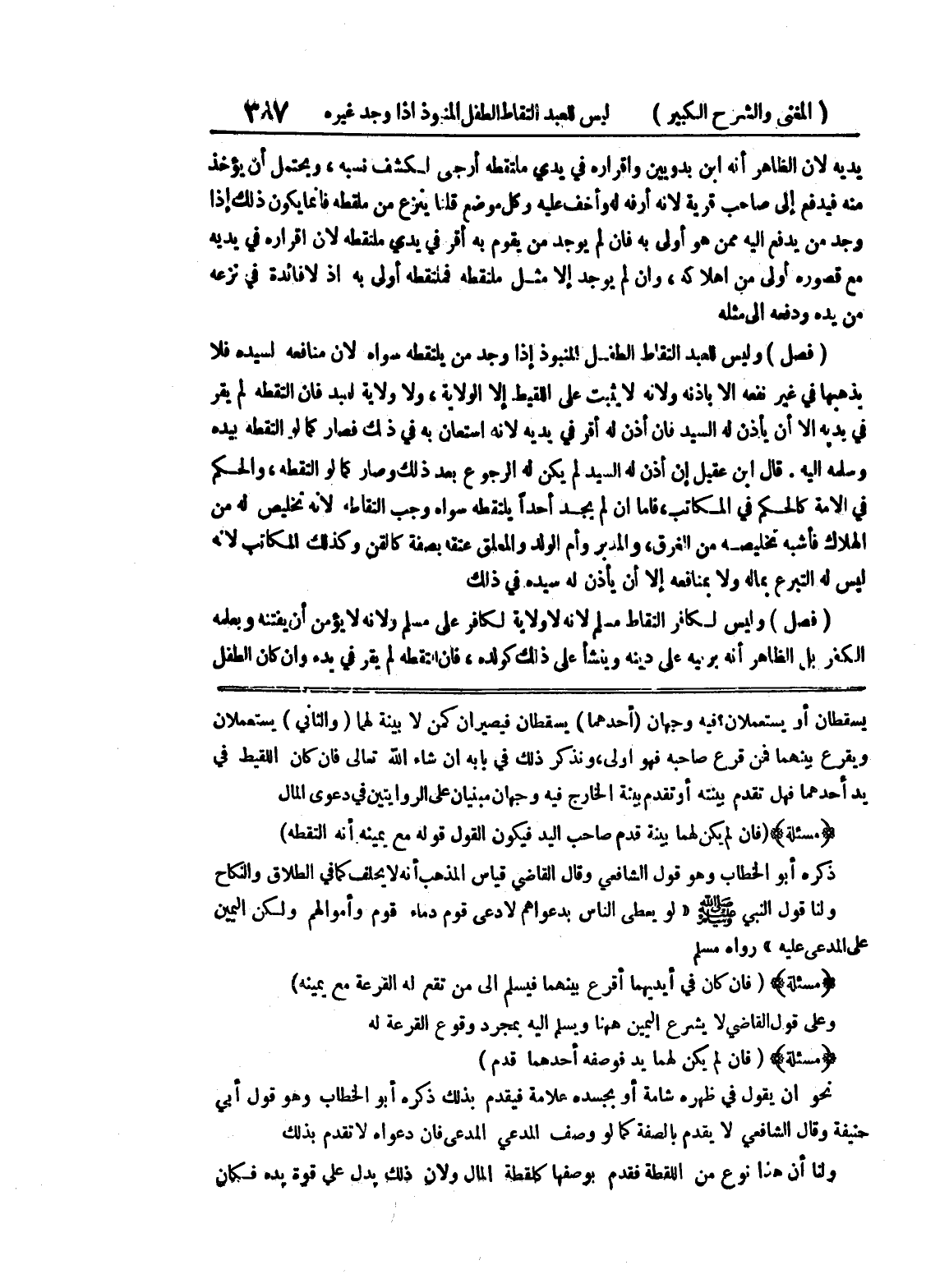 يسقطان أو يستعملان؟ فيه وجهان (أحدهما) يسقطان فيصيران كمن لا بينة لهما (والثاني) يستعملان ويقرع بينهما فمن قرع صاحبه فهو أولى، ونذكر ذلك في بابه إن شاء الله تعالى فإن كان اللقيط في يد أحدهما فهل تقدم بينته أو تقدم بينة الخارج فيه وجهان مبنيان على الروايتين في دعوى المال * (مسألة) * (فإن لم يكن لهما بينة قدم صاحب اليد فيكون القول قوله مع يمينه أنه التقطه) ذكره أبو الخطاب وهو قول الشافعي وقال القاضي قياس المذهب أنه لا يحلف كما في الطلاق والنكاح ولنا قول النبي صلى الله عليه وسلم " لو يعطى الناس بدعواهم لادعى قوم دماء قوم وأموالهم ولكن اليمين على المدعى عليه " رواه مسلم * (مسألة) * (فإن كان في أيديهما أقرع بينهما فيسلم إلى من تقع له القرعة مع يمينه) وعلى قول القاضي لا يشرع اليمين ههنا ويسلم إليه بمجرد وقوع القرعة له * (مسألة) * (فإن لم يكن لهما يد فوصفه أحدهما قدم) نحو أن يقول في ظهره شامة أو بجسده علامة فيقدم بذلك ذكره أبو الخطاب وهو قول أبي حنيفة وقال الشافعي لا يقدم بالصفة كما لو وصف المدعي المدعى فإن دعواه لا تقدم بذلك ولنا أن هـ؟ انوع من اللقطة فقدم بوصفها كلقطة المال ولأن ذلك يدل على قوة يده فكان