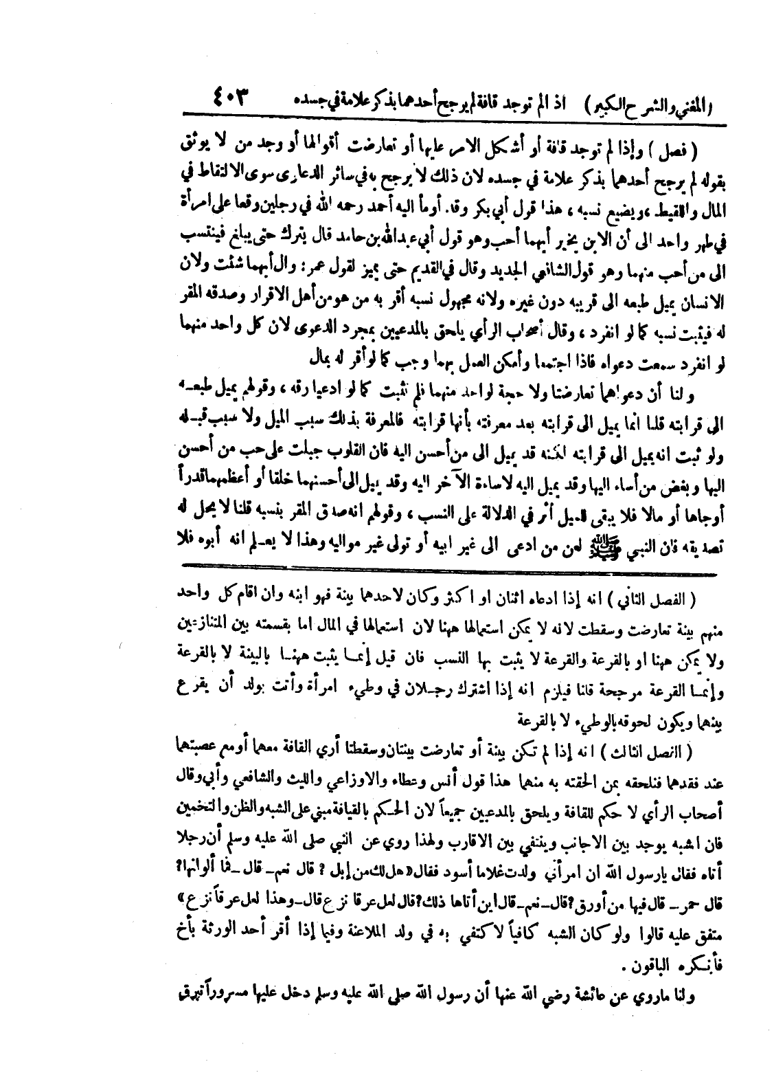 منهم بينة تعارضت وسقطت لأنه لا يمكن استعمالها ههنا لأن استعمالها في المال إما بقسمته بين المتنازعين ولا يمكن ههنا أو بالقرعة لا يثبت بها النسب فإن قيل إنما يثبت ههنا بالبينة لا بالقرعة وإنما القرعة مرجحة قلنا فيلزم أنه إذا اشترك رجلان في وطئ امرأة وأتت بولد أن يقرع بينهما ويكون لحوقه بالوطئ لا بالقرعة (الفصل الثالث) أنه إذا لم تكن بينة أو تعارضت بينتان وسقطتا أري القافة معهما أو مع عصبتهما عند فقدهما فنلحقه بمن ألحقته به منهما هذا قول أنس وعطاء والاوزاعي والليث والشافعي وأبي وقال أصحاب الرأي لا حكم للقافة ويلحق بالمدعيين جميعاً لأن الحكم بالقيافة مبني على الشبه والظن والتخمين فان اشبه يوجد بين الأجانب وينتفي بين الأقارب ولهذا روي عن النبي صلى الله عليه وسلم إن رجلاً أتاه فقال يا رسول الله إن امرأتي ولدت غلاماً أسود فقال " هل لك من ابل؟ قال نعم - قال - فما الوانها؟ قال حمر - قال فيها من أورق؟ قال - نعم - قال أين أتاها ذلك؟ قال لعل عرقاً نزع قال - وهذا لعل عرقاً نزع " متفق عليه قالوا ولو كان الشبه كافياً لاكتفي به في ولد الملاعنة وفيها إذا أقر أحد الورثة بأخ فأنكره الباقون.