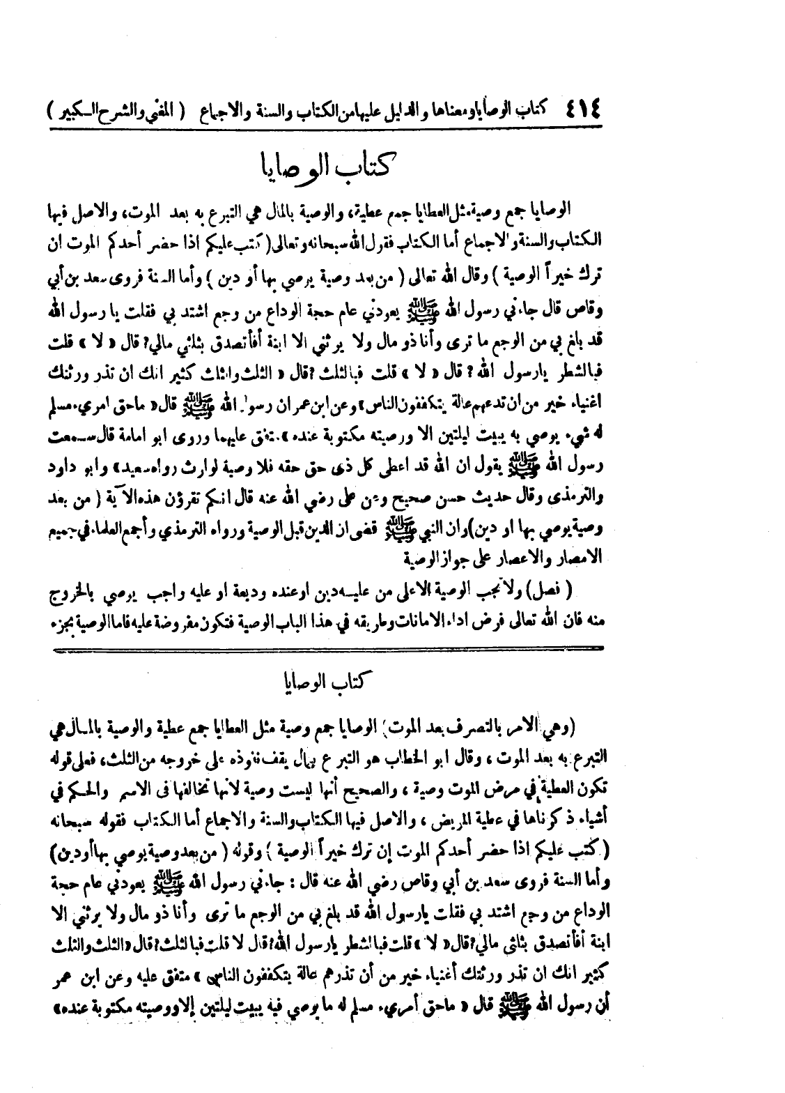 كتاب الوصايا (وهي الأمر بالتصرف بعد الموت) الوصايا جمع وصية مثل العطايا جمع عطية والوصية بالمال هي المتبرع به بعد المو ت، وقال أبو الخطاب هو التبرع بمال يقف نفوذه على خروجه من الثلث، فعلى قوله تكون العطية في مرض الموت وصية، والصحيح أنها ليست وصية لأنها تخالفها في الاسم والحكم في أشياء ذكرناها في عطية المريض، والأصل فيها الكتاب والسنة والإجماع أما الكتاب فقوله سبحانه (كتب عليكم إذا حضر أحدكم الموت إن ترك خيرا الوصية) وقوله (من بعد وصية يوصى بها أو دين) وأما السنة فروى سعد بن أبي وقاص رضي الله عنه قال: جاءني رسول الله صلى الله عليه وسلم يعودني عام حجة الوداع من وجع اشتد بي فقلت يا رسول الله قد بلغ بي من الوجع ما ترى وأنا ذو مال ولا يرثني إلا ابنة أفأتصدق بثلثي مالي؟ قال " لا " قلت فبالشطر يا رسول الله؟ قال لا قلت فبالثلث؟ قال " الثلث والثلث كثير إنك إن تذر ورثتك أغنياء خير من أن تذرهم عالة يتكففون الناس " متفق عليه وعن ابن عمر أن رسول الله صلى الله عليه وسلم قال " ما حق امرئ مسلم له ما يوصي ففيه يبيت ليلتين إلا ووصيته مكتوبة عنده "