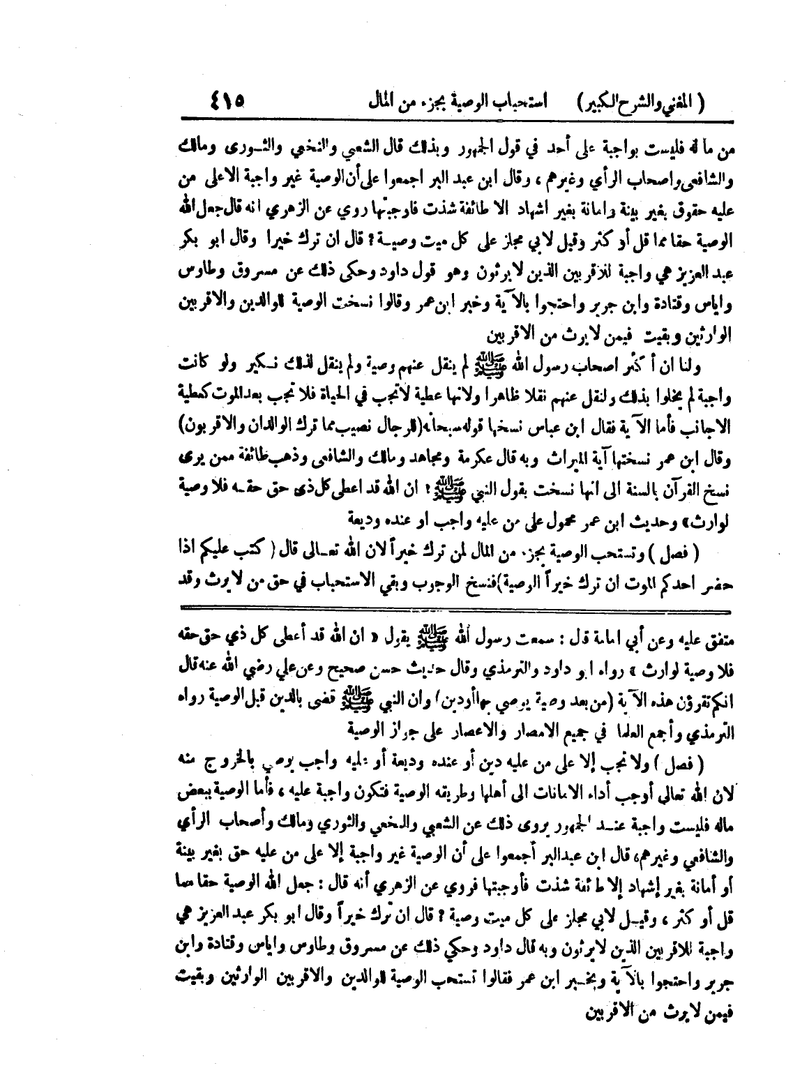 انكم تقرؤن هذه الآية (من بعد وصية يوصى بها أو دين) وأن النبي صلى الله عليه وسلم قضى بالدين قبل الوصية رواه الترمذي وأجمع العلما في جميع الامصار والأعصار على جواز الوصية (فصل) ولا تجب إلا على من عليه دين أو عنده وديعة أو عليه واجب يوصي بالخروج منه لأن الله تعالى أوجب أداء الأمانات إلى أهلها وطريقه الوصية فتكون واجبة عليه، فأما الوصية ببعض ماله فليست واجبة عند الجمهور يروي ذلك عن الشعبي والنخعي والثوري ومالك وأصحاب الرأي والشافعي وغيرهم، قال ابن عبد البر اجمعوا على أن الوصية غير واجبة إلا على من عليه حق بغير بينة أو أمانة بغير إشهاد إلا طائفة شذت فأوجبتها فروي عن الزهري أنه قال: جعل الله الوصية حقاً مما قل أو كثر، وقيل لأبي مجلز على كل ميت وصية؟ قال إن ترك خيرا وقال أبو بكر عبد العزيز هي واجبة للأقربين الذين لا يرثون وبه قال داود وحكي ذلك عن مسروق وطاوس واياس وقتادة وابن جرير واحتجوا بالآية وبخبر ابن عمر فقالوا تستحب الوصية للوالدين والأقربين الوارثين وبقيت فيمن لا يرث من الأقربين
